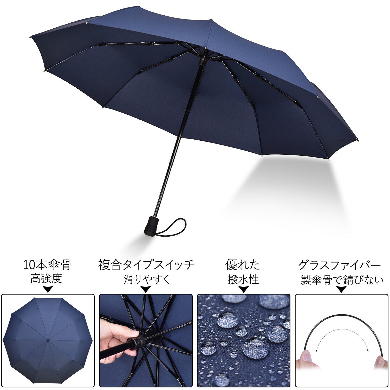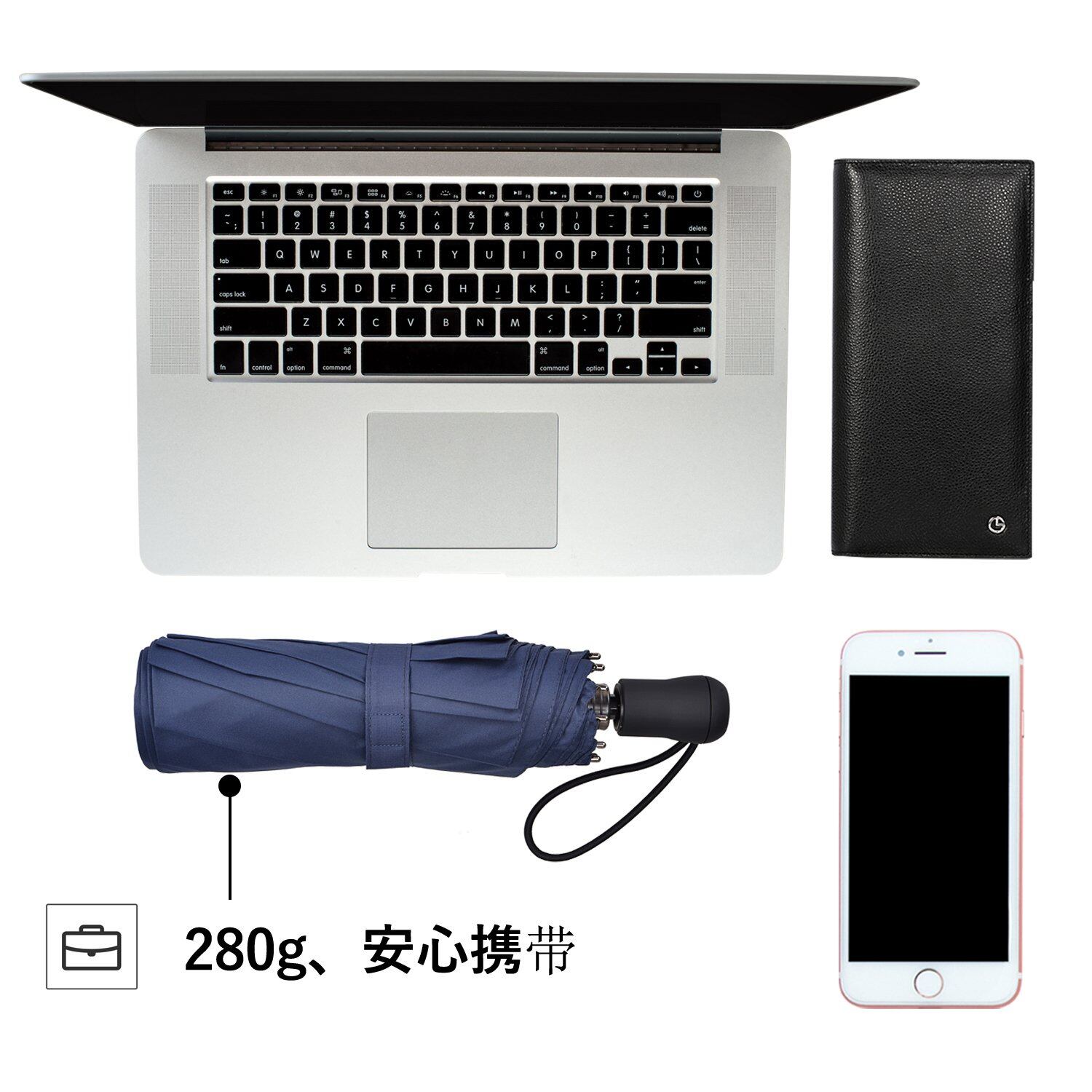 「おりたたみ傘 軽量」 280 グラム以下の軽量性を実現するため、傘骨にはグラスファイバーとアルミニウムの複合フレームを採用。折り畳んだ状態はたっだ 28 センチで、バッグにすっぽり収まる超コンパクトデザイン。吸水カバー付きで雨後も濡れずに持ち運べ、急な雨でも「軽くて常備できる」安心感が最大の魅力です。TAIKUU の軽量折りたたみ傘、丈夫な 10 骨構造とドデカゴンシャフトで風速 12m/s(約 6 級風)にも耐え、「軽さ × 耐久性」のバランスを徹底追求しました。