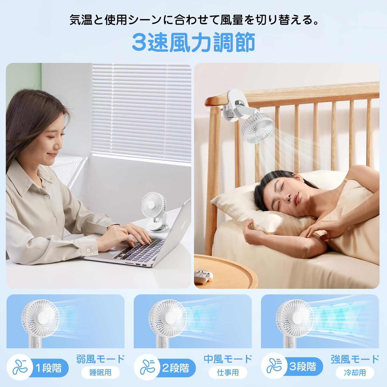 【3 段階風量切替 & 3 枚羽根設計 & 超静音】携帯扇風機は弱・中・強の 3 段階の風量調節機能を搭載しており、使用時にはお好みに合わせて自由に風量を調節できます。この携帯扇風機は 3 枚の羽根を採用し、羽根全体を流線型デザインにすることで、効率的に風を集めることができます。最新の DC モーター技術を採用し、どんな時もさわやかな自然風を送り出します。静音性にもこだわって、自分にも周りの人にも迷惑をかけず、勉強や仕事に集中できる環境を提供します。