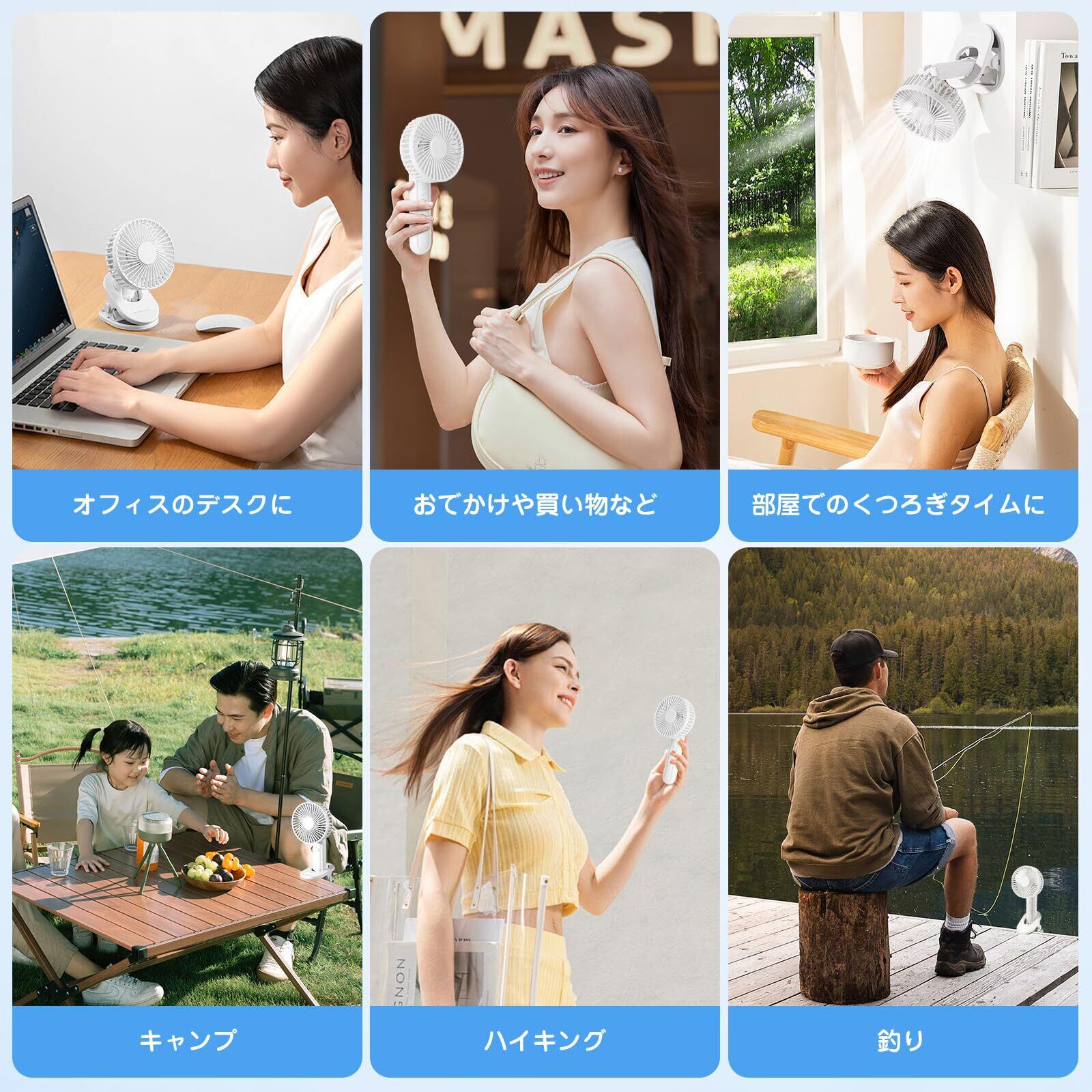 【2025年新登場1台4役扇風機】手持ち扇風機、卓上扇風機、壁掛け扇風機、スマホスタンドの4つの機能を兼ね備えています。デスク上に置けば卓上扇風機として使え、持ち歩けばハンディファンとして使えます。また、ファンとクリップを組み合わせることで、壁に掛けられる壁掛け扇風機にもなります。さらに、スマホを見たい時は、スマホスタンドとして使用することも可能です。 3 段階風量切替 & 3 枚羽根設計 & 超静音】携帯扇風機は弱・中・強の 3 段階の風量調節機能を搭載しており、使用時にはお好みに合わせて自由に風量を調節できます。この携帯扇風機は 3 枚の羽根を採用し、羽根全体を流線型デザインにすることで、効率的に風を集めることができます。最新の DC モーター技術を採用し、どんな時もさわやかな自然風を送り出します。静音性にもこだわって、自分にも周りの人にも迷惑をかけず、勉強や仕事に集中できる環境を提供します。 【5000mAh大容量バッテリー・最大14時間の連続使用】 一般の携帯扇風機の2倍の5000mAh大容量バッテリーを搭載。Type-C急速充電に対応し、パソコンや車載USB充電器、モバイルバッテリーから直接使用可能。3~4時間のフル充電で最大14時間の連続送風を実現。バッグや車に常備しておけば、いつでもどこでも快適な涼しさを手に入れられます。 【180度折り畳み式&洗いやすい】上下180度の角度調節が可能で、風を好きな方向に向けられます。更に、携帯扇風機の前カバーは簡単に取り外せるため、水洗いもOKでお手入れが楽々! 【安全重視 & 安心なアフターサービス】️ハンディファンは爆発などのリスクを回避するために長い間テストを行い、安全な PCB 回路設計を採用し、独立なリチウム電池を採用し、過充電・過放電・短路を回避し、耐用年数を延長します。徹底した安全設計を施しました。また、使用中に何か分からない点があれば、お気軽に弊社までお問い合わせください。