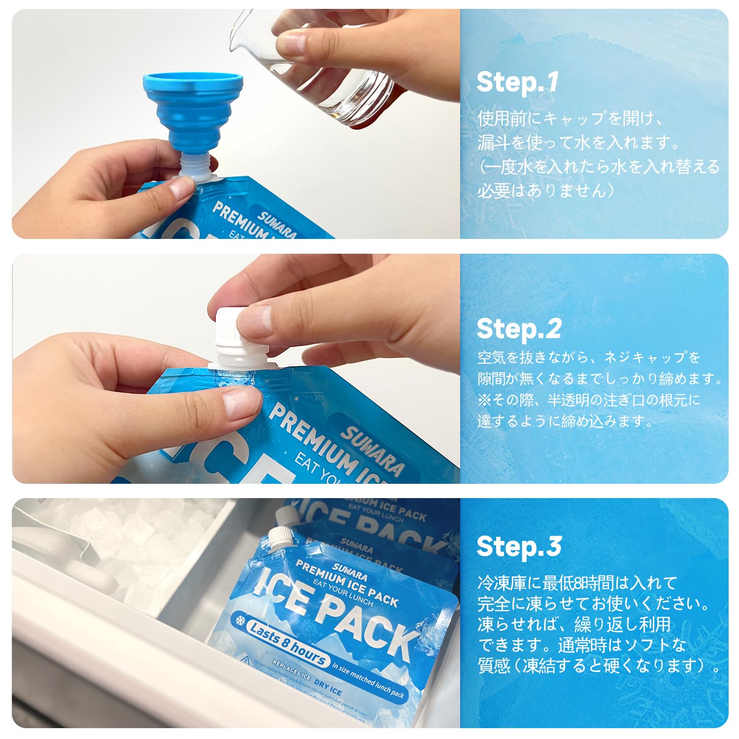 使用方法:1.使用前にキャップを開け、漏斗を使って水を入れます。((一度水を入れたら水を入れ替える必要はありません)2.空気を抜きながら、ネジキャップを隙間が無くなるまでしっかり締めます。※その際、半透明の注ぎ口の根元に達するように締め込みます。3.冷凍庫に最低8時間は入れて完全に凍らせてお使いください。凍らせれば、繰り返し利用できます。通常時はソフトな質感(凍結すると硬くなります)