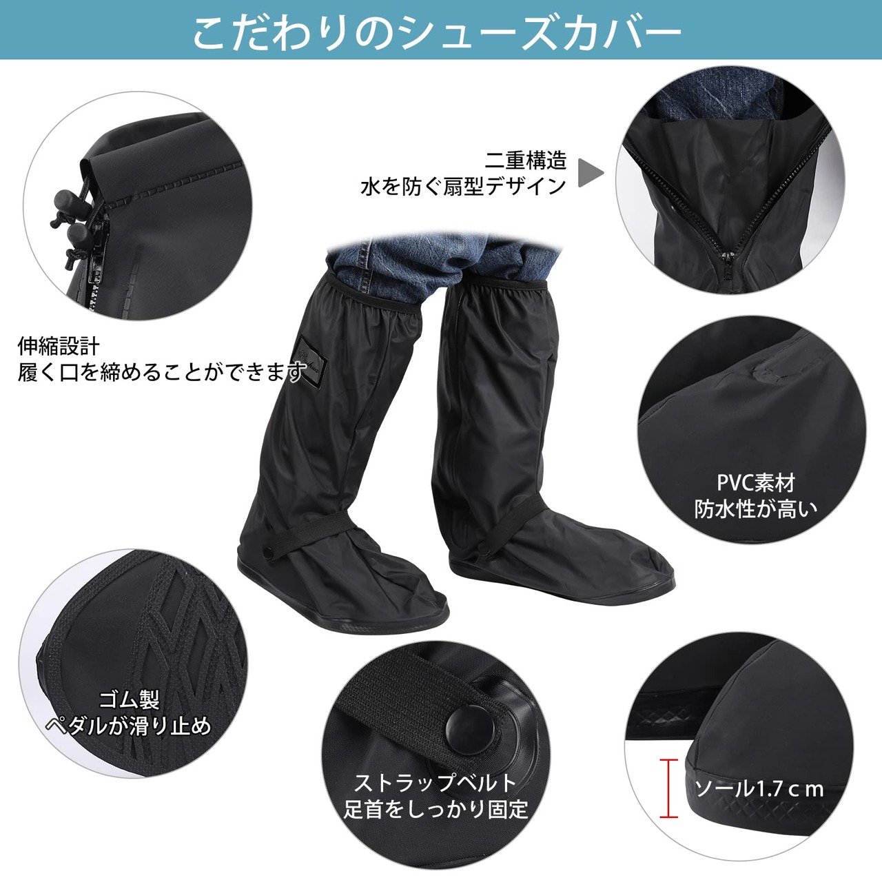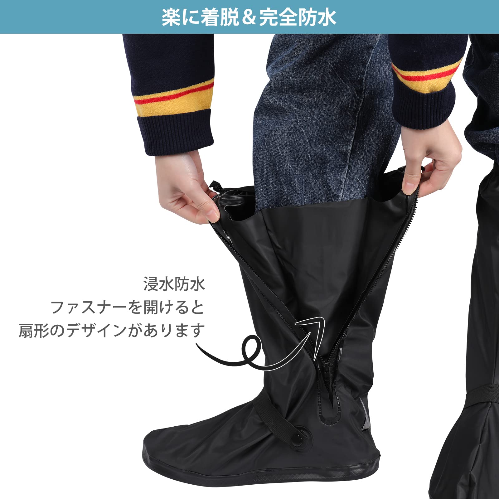 完全防水:二重構造、靴カバーのファスナーを開けると扇形のデザインがあります。ダブル防水することができます。まだ、伸縮バンド付き、履く口を締めることができます。防水効果が高いです。