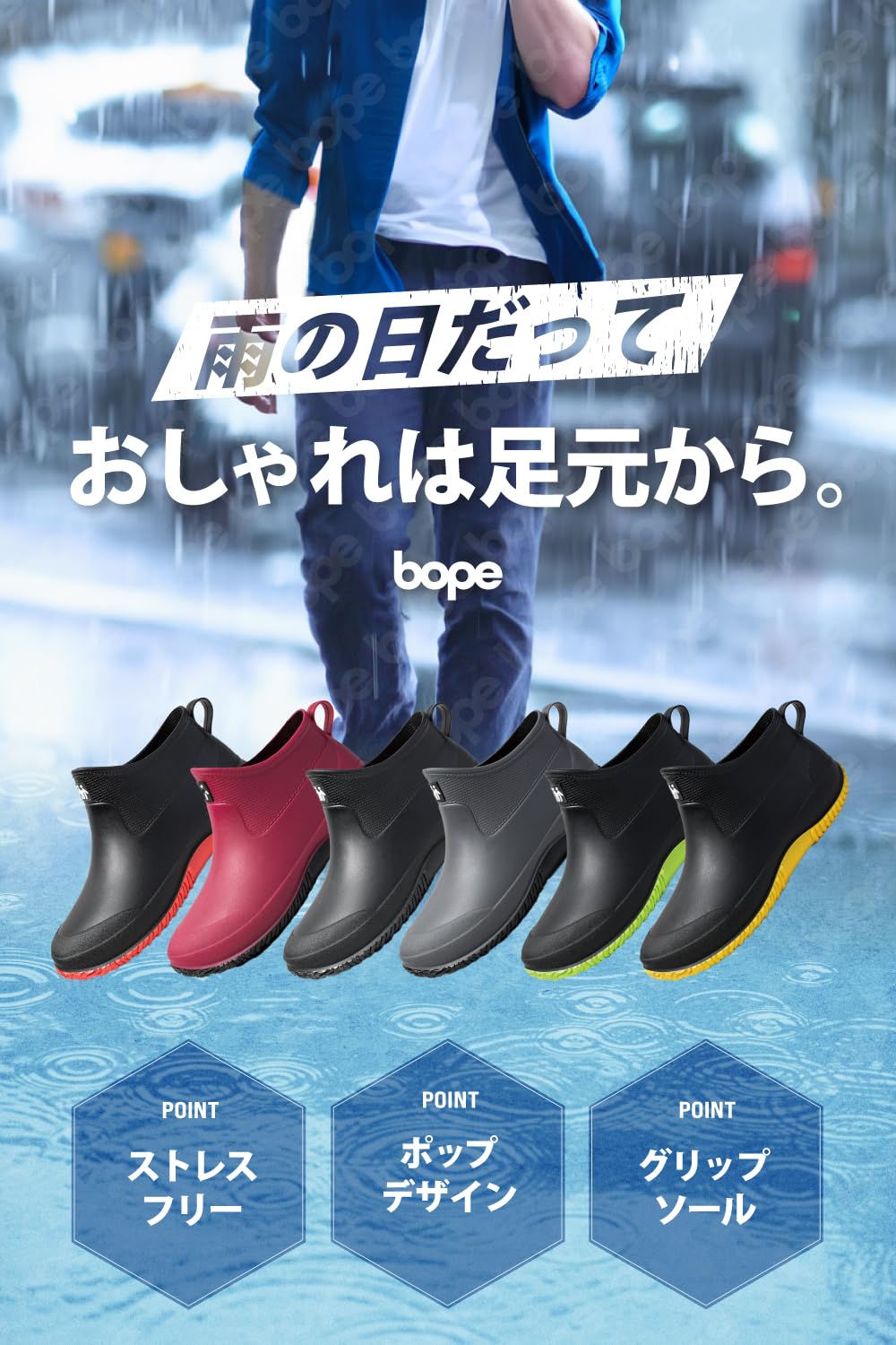 【ビタミン・カラー】雨天もスタイリッシュに攻めるなら、bopeのメンズレインシューズがおすすめ。カジュアルからウォーキングまで幅広く活躍する一足です