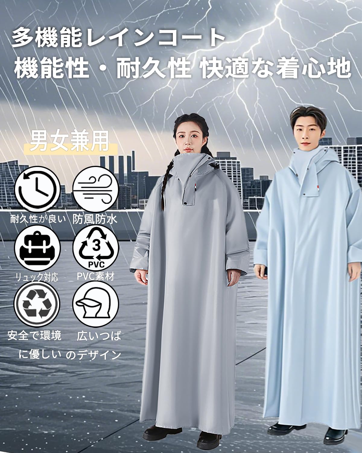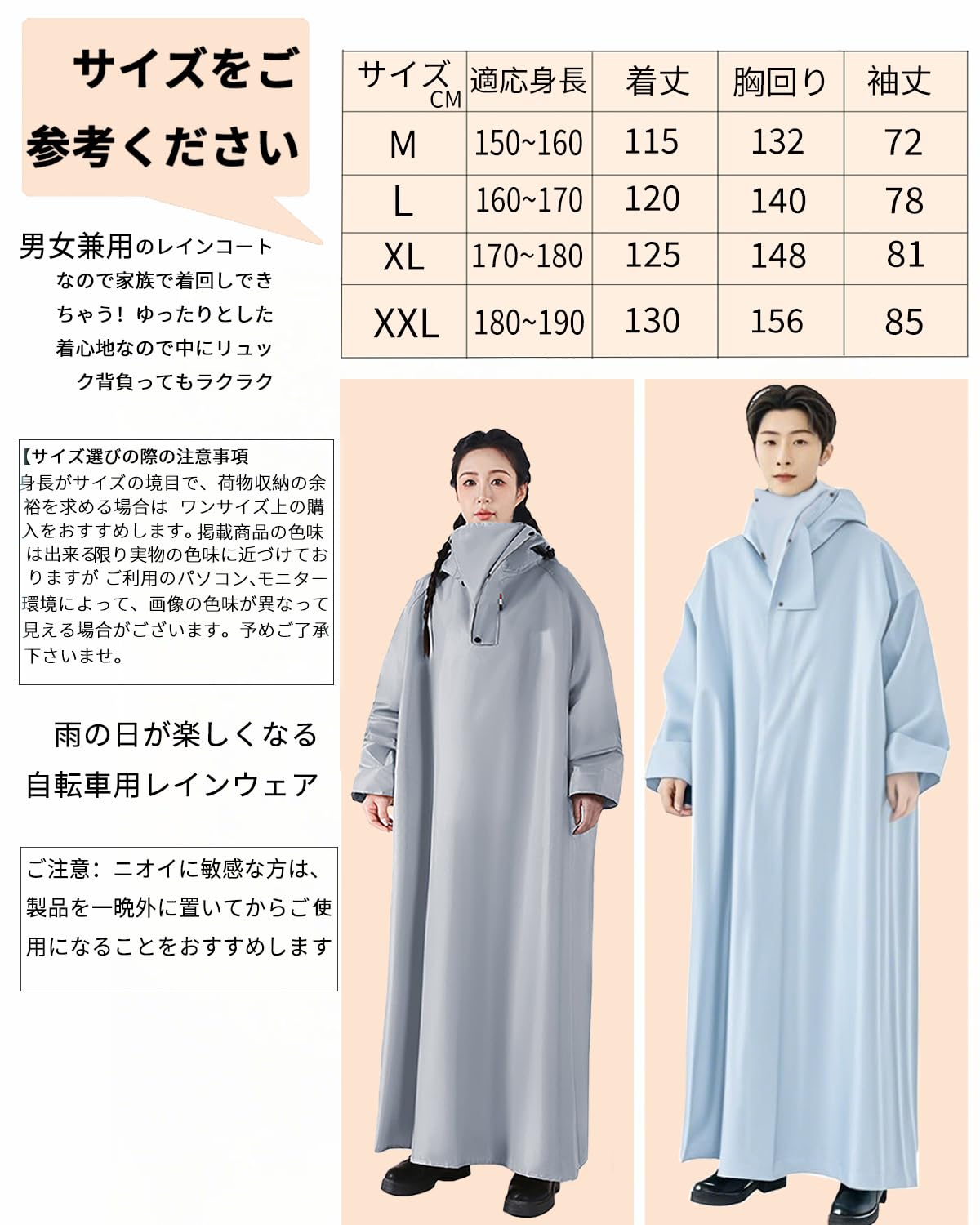 【防水&防風&耐摩が抜群】耐水圧は15,000~30,000mmで、台風にも対応可能です。このレインコートは、高品質なナイロンオックスフォード布とPU防水素材で作られており、傷がつきにくく、しっかりとした厚みがあり、防水性が高く丈夫で破れにくく、耐久性に優れています。レインコートの表面には防水コーティングが施されています。お届け後は風通しの良い日陰で乾かすことをおすすめします。通気性がないため、わずかな新しい素材の匂いが含まれています。匂いに敏感な方や気になる方は、軽く洗ってから日陰で乾かすと、匂いを軽減できます。