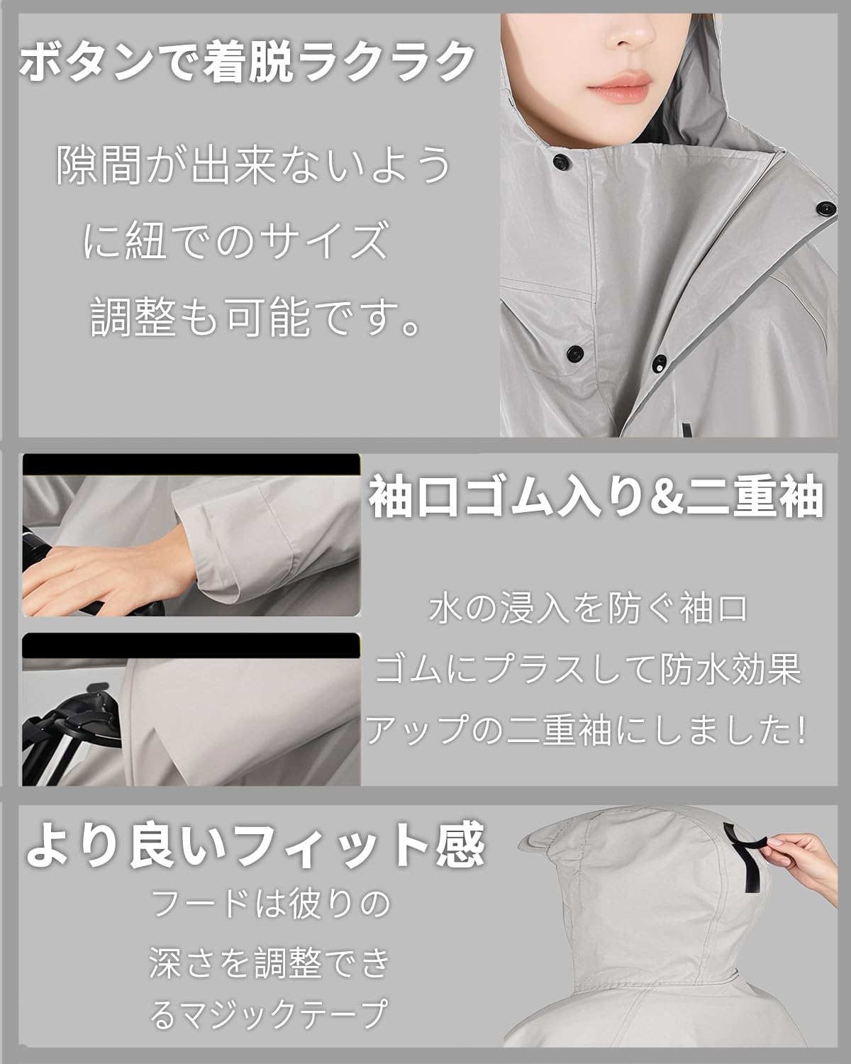 【素材&サイズ】ポリエステル100%、 裏側:ポリウレタンコ一ティング、重量:約610g 耐水圧: 15,000 mm M :前丈115cm,バスト132cm,袖丈72cm,適応身長:150〜160cm L:前丈120cm,バスト140cm,袖丈78cm,適応身長:160〜170cm XL:前丈125cm,バスト148cm,袖丈81cm,適応身長:170〜180cm。