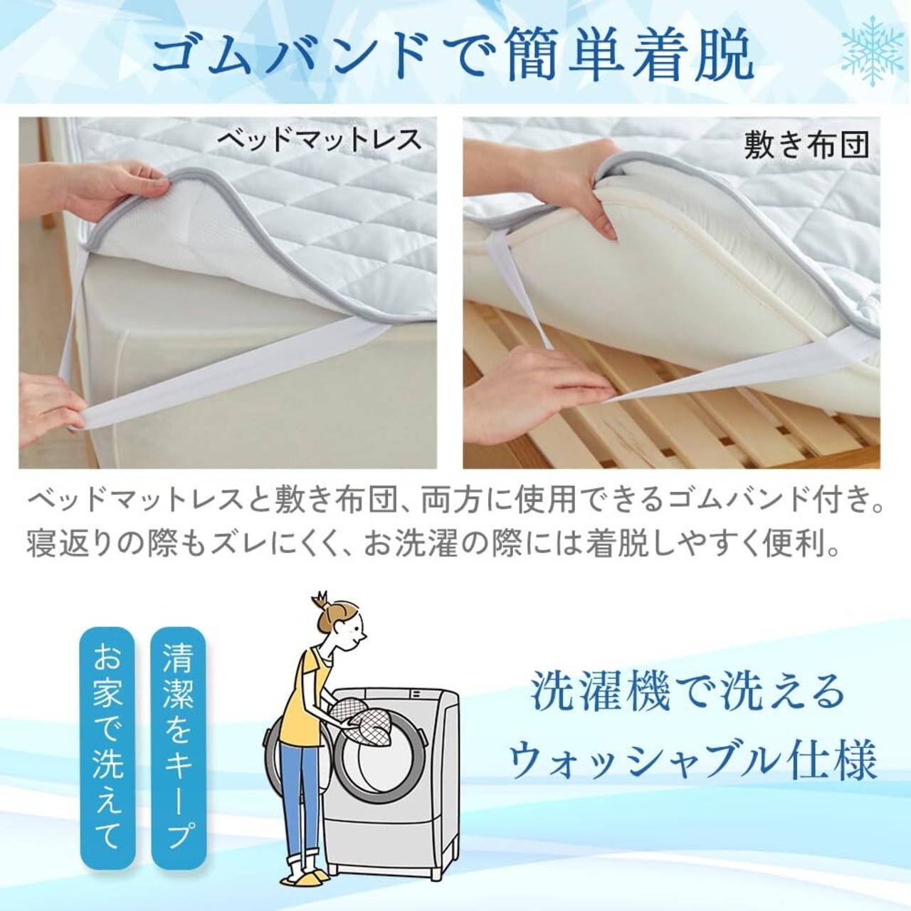 中綿には、もっちりふっくらのマイクロファイバー綿を採用しているので包み込まれるような敷パッドに仕上げています。