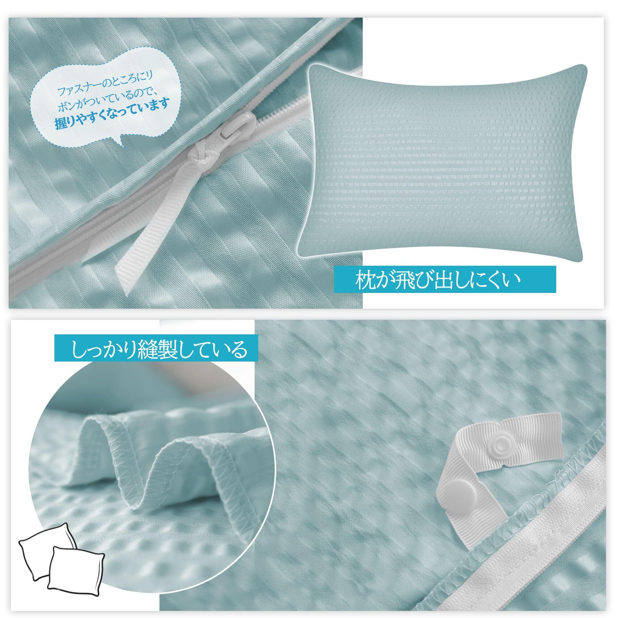 【シアサッカー風生地】枕ガバーはサラッとドライタッチな表面がポコポコとしたシアサッカー風の素材を使用。シアサッカーとはさらりとした感触で肌ざわりもよく、涼しくて快適な夏にオススメの素材です。くしゆくしゅしたシワ感が特徴的な凹凸感のある生地です。四季を通じて利用できます。
