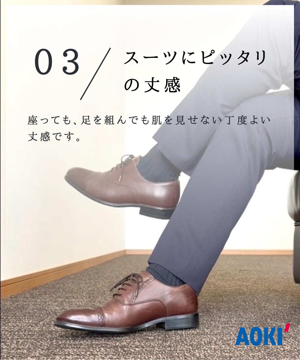 座った時にズボンの裾が上がっても、すねのあたりの素肌は見せない丈なのでスーツや礼服を着用するシーンや仕事、制服、カジュアルでもお使い頂けます。