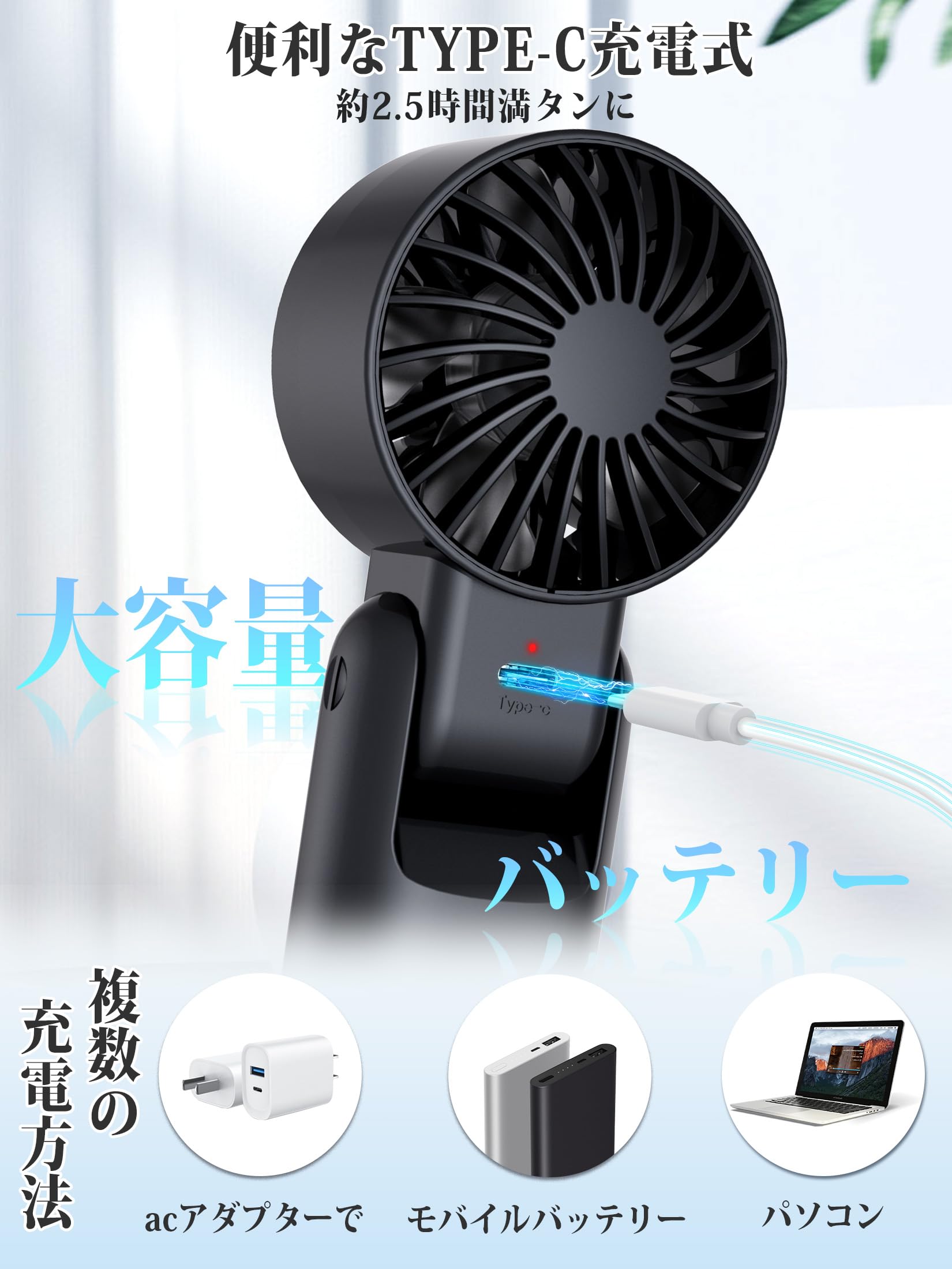 【大容量バッテリー・最長15時間連続使用・安全性と品質を重視】扇風機 ハンディは大容量3000mAhのバッテリを内蔵し、フル充電時で長時間の連続動作が可能です、野外でのイベントやテーマパークなど、長時間使用したい人にもおすすめです。フル充電は僅か2.5hかかり、消費電力を低減できる省エネハンド扇風機です。USBポート搭載で、複数の充電方法をサポートしてますので、パソコンや充電器、モバイルバッテリーで充電可能で、送風しながら充電も可能です。コードレスで使えるので、アウトドア・散歩・通勤・買い物などの移動中で使用でき、さまざまなシーンで活躍する扇風機。せんふうき扇風機 小型 手持ちは爆発などのリスクを回避するために長い間テストを行い、PCB回路の安全設計で、独立なリチウム電池を採用し、過充電過放電短路を回避し、耐用年数を延長させます。お客様に安心してご利用いただけます。