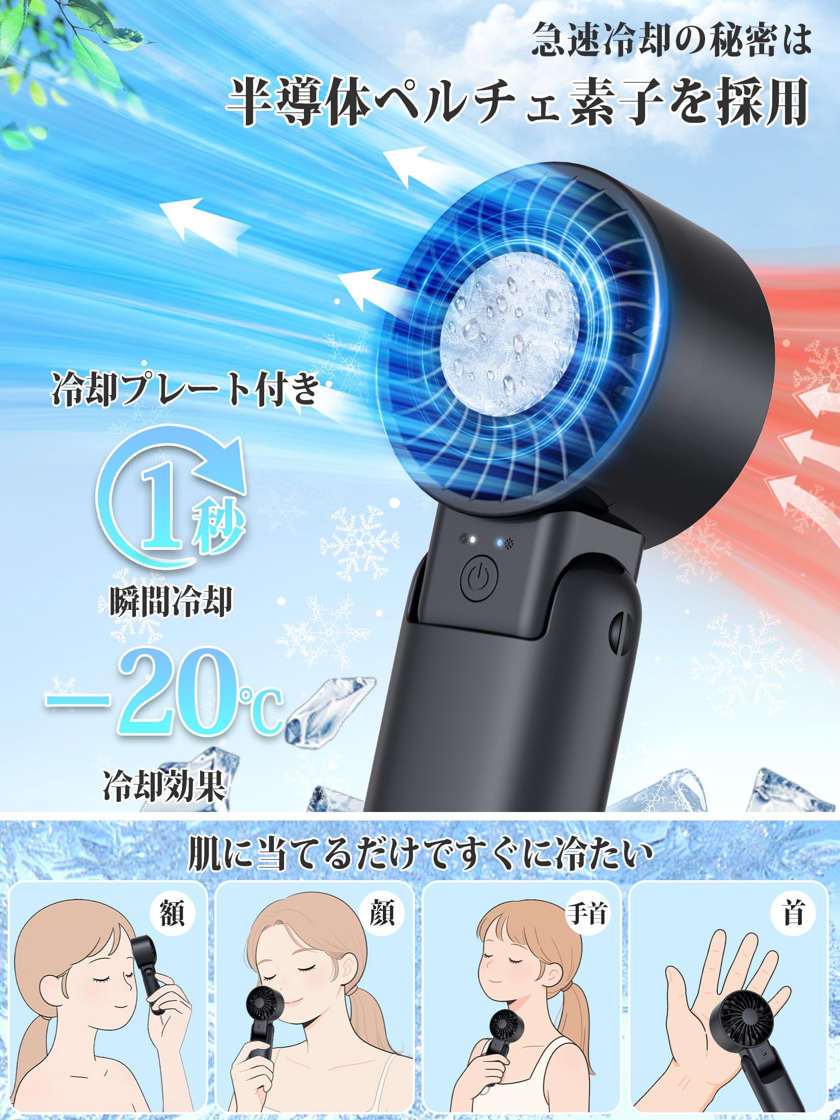 【2025年新登場・-20℃新体感・1台6役扇風機】携帯扇風機とは、持ち運ぶことができる小型の扇風機のことで、夏の通勤や屋外イベントに欠かせないものです。 弊社のハンディ扇風機は一般的な手持ち扇風機、卓上扇風機、首掛け扇風機の3WAYだけでなく、ペルチェ素子による冷却プレートを採用して、半導体冷房チップを内蔵し、「便利な小型エアコン」に変身しました。冷却ファンやアイスパックなど機能を持って、暑い夏でも氷をつけるように瞬間的に熱い肌を冷やすことができ、体感温度を下げることができます。換気と冷却の効果同時に実現し暑さが一掃されます。真夏の熱中症対策として最適、一度使うと手放せないハンディファン 冷却プレートです。