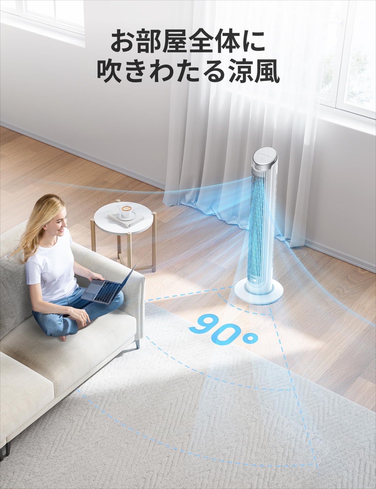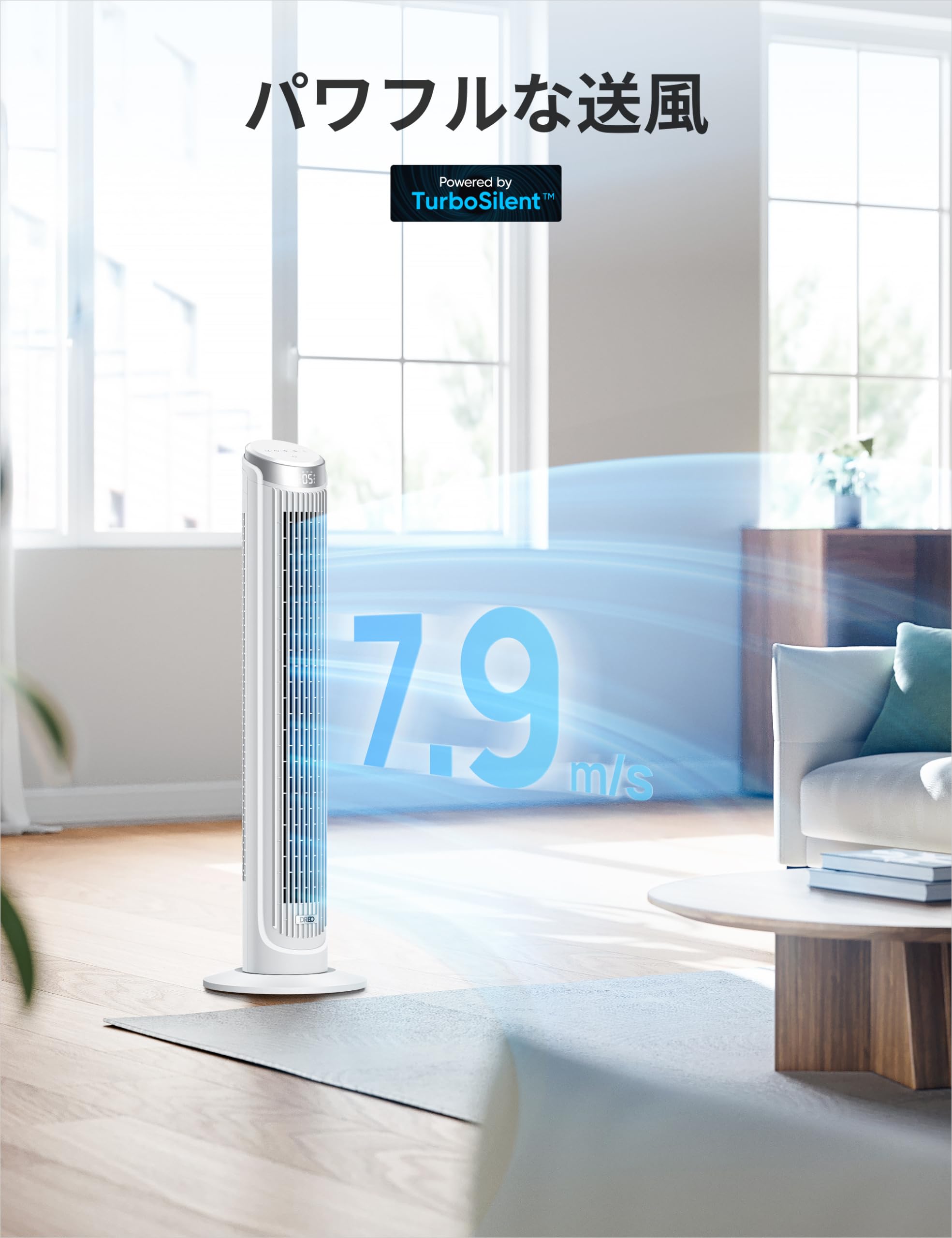 【自動90°首振り&34dB静音】左右90°の範囲で首振り運転をする。お部屋全体に風を届ける。Dreoのタワーファンは直流で羽を回すACモーターを搭載し、1-5段階のきめ細やかに風量を調節可能。静かな運転音で快眠。あなたを起こさず、そっと静かにサポート。