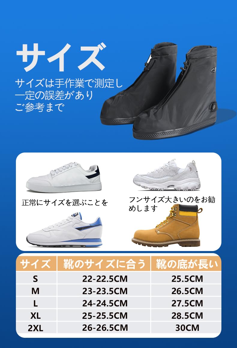 【高い防水性】シューズカバーは完全防水のPVC素材を使用しており、厚さが適度で軽量かつ耐摩耗性があります。ファスナーと内部の扇形防水層の二重防水設計により、水や汚れの浸入をしっかり防ぎます!靴の上から履くだけで、大切な靴を水や泥から効果的に保護できます。