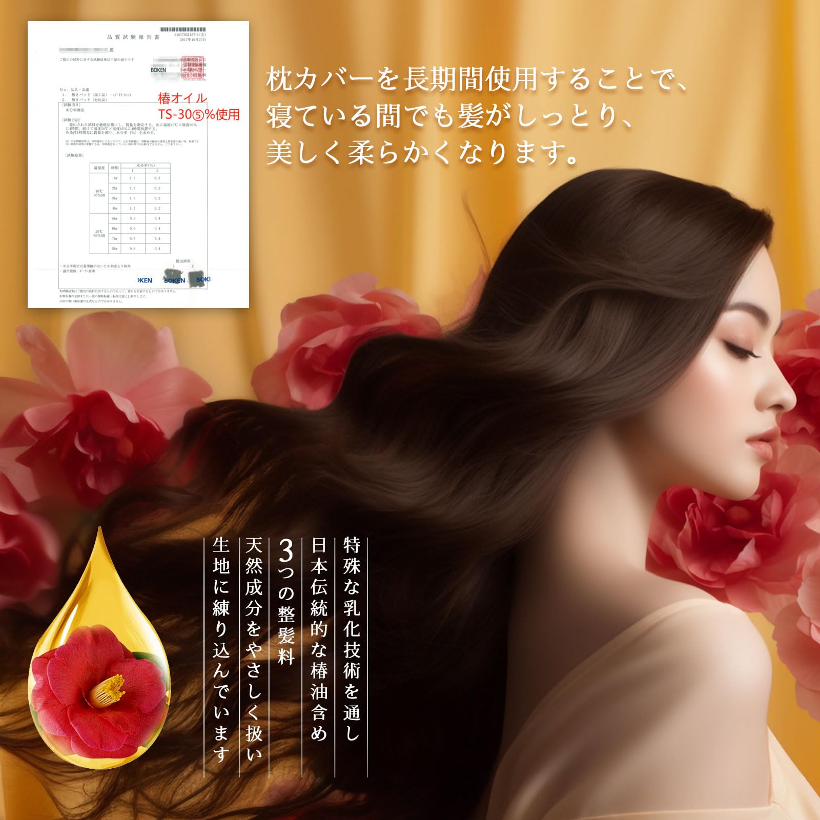 【髪にも良い】 椿オイルは髪の毛の保湿やダメージを修復する効果があるため、椿オイル保湿剤を添加した枕カバーに使用することで髪の毛の保護にも役立ちます。