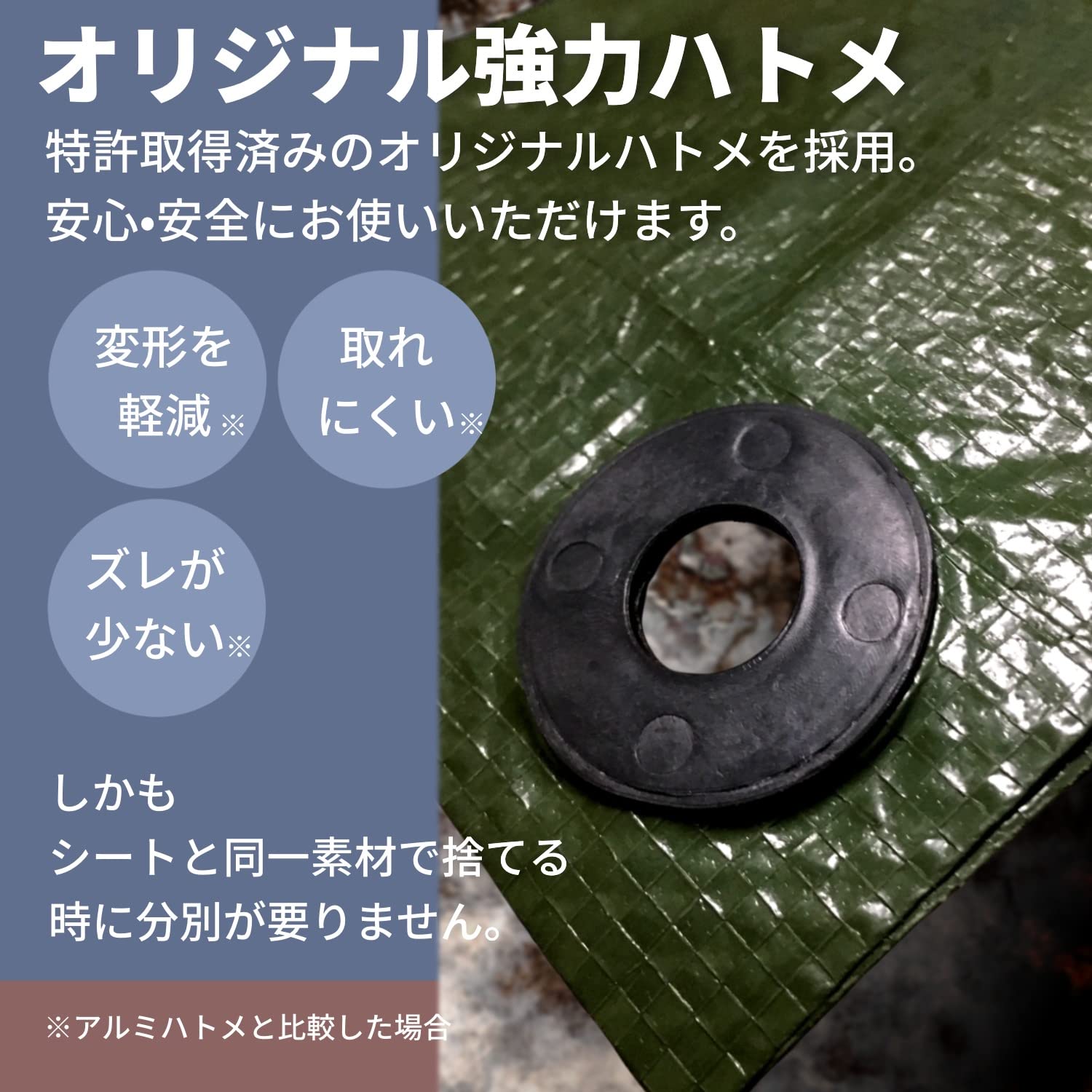 【オリジナルハトメ】当社オリジナルのプラハトメを採用。一般的なアルミハトメよりも変形・ズレ・脱落に強い仕様のハトメとなっています。シートと同一素材のため廃棄時に分別も必要ありません。