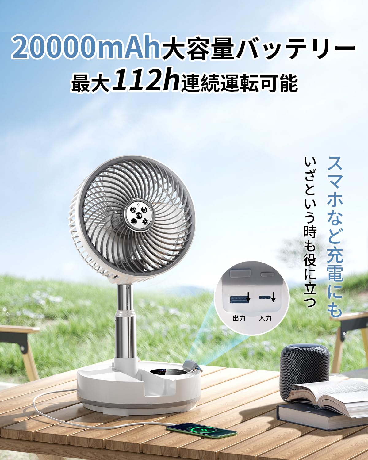 【超大容量20000mAh&スマホの充電にも】1回のフル充電で約最大112時間使える大容量バッテリー内蔵されたキャンプ 扇風機。トイレやキッチンなど室内に限らず、コンセントの位置を考えずに好きな場所に設置できるので、キャンプや車中泊などアウトドアシーンでも活躍します。数日の使える大容量バッテリー、さらにモバイルバッテリーとしてスマホに充電にもできるので、猛暑日はキャンプ場へ持ち運びに行くことで一発解決!涼しく快適に過ごすことができます。