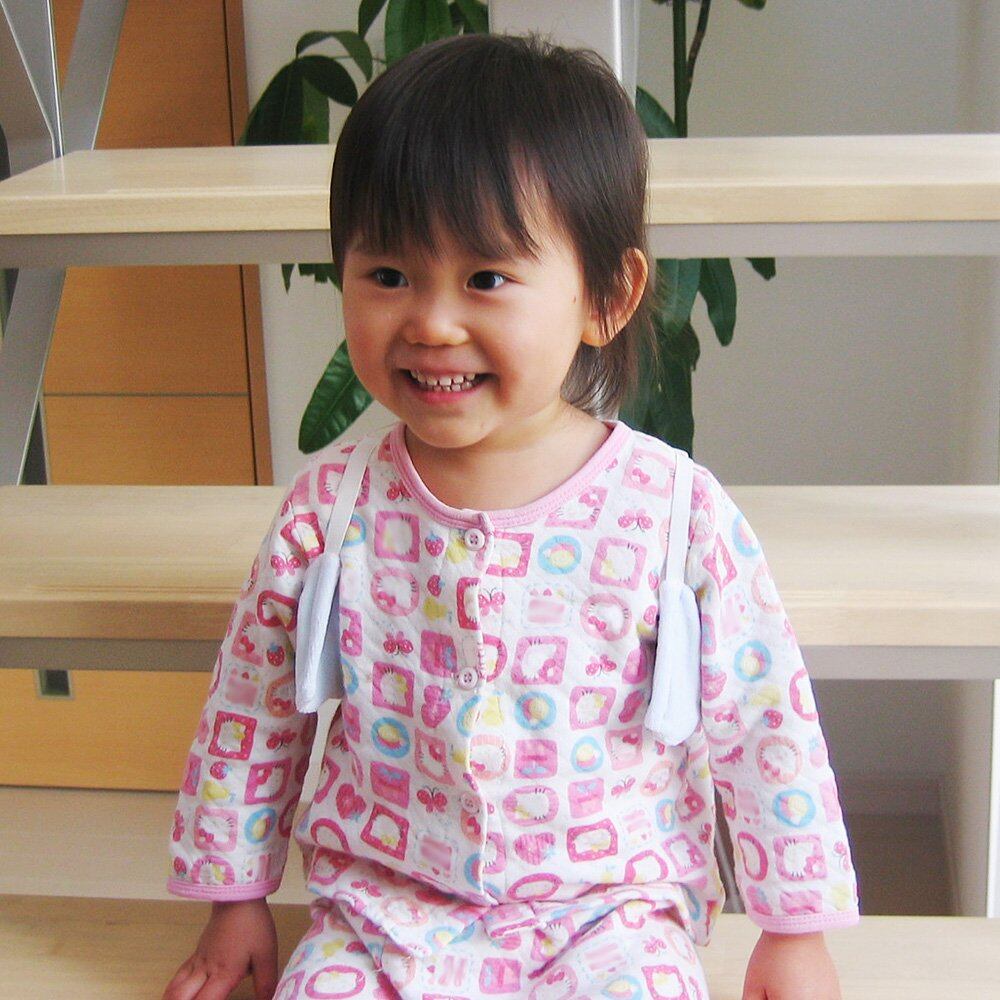 2.下着やパジャマを着た小児の腕を両サイドのゴムより通し、ジェル袋をわき下につけます。
