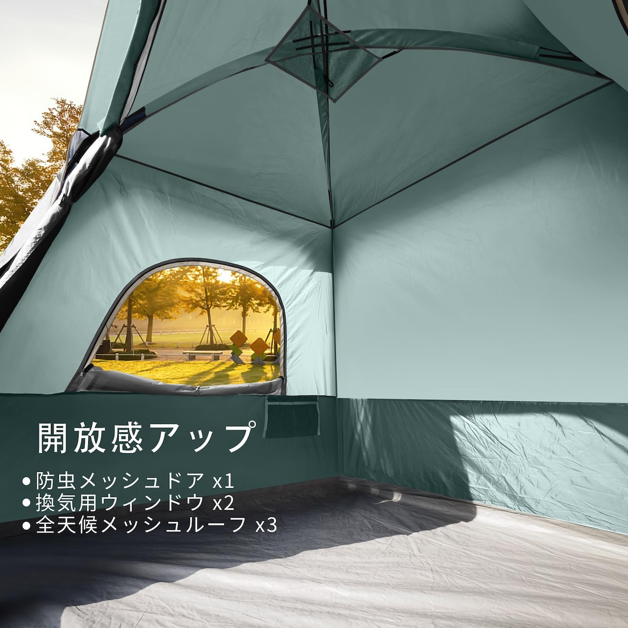 【360°快適換気システム】 キャンプテントは防虫メッシュドア1ヶ所+大型メッシュ窓2ヶ所+天窓の3WAY通気構造です。ジッパー調節式ベンチレーションで湿度管理が可能。星空観測や朝日のパノラマビューを楽しめます。