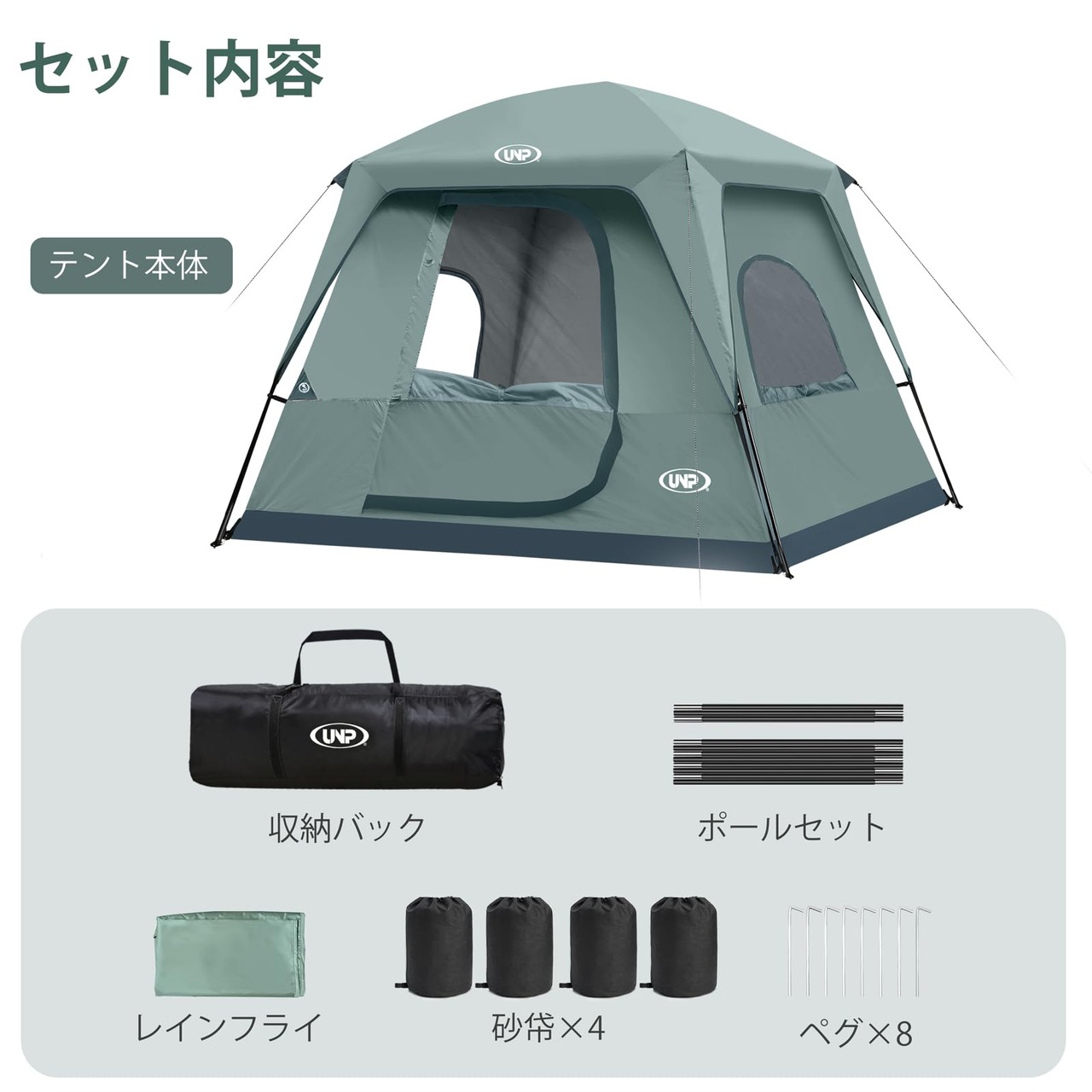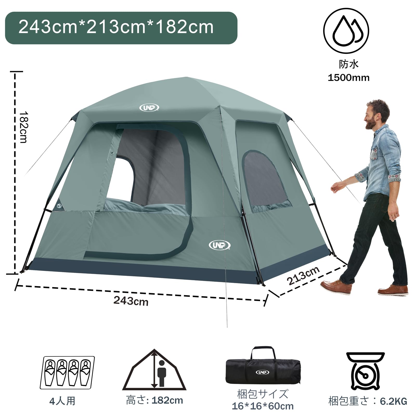 UNP キャビンテント 4人用 大空間 キャンプテント 簡単設営 防水加工&上部レインフライ付き 組み立て式 収納袋付き 登山/花見/防災用 サイズ :243cm×213cm×182cm