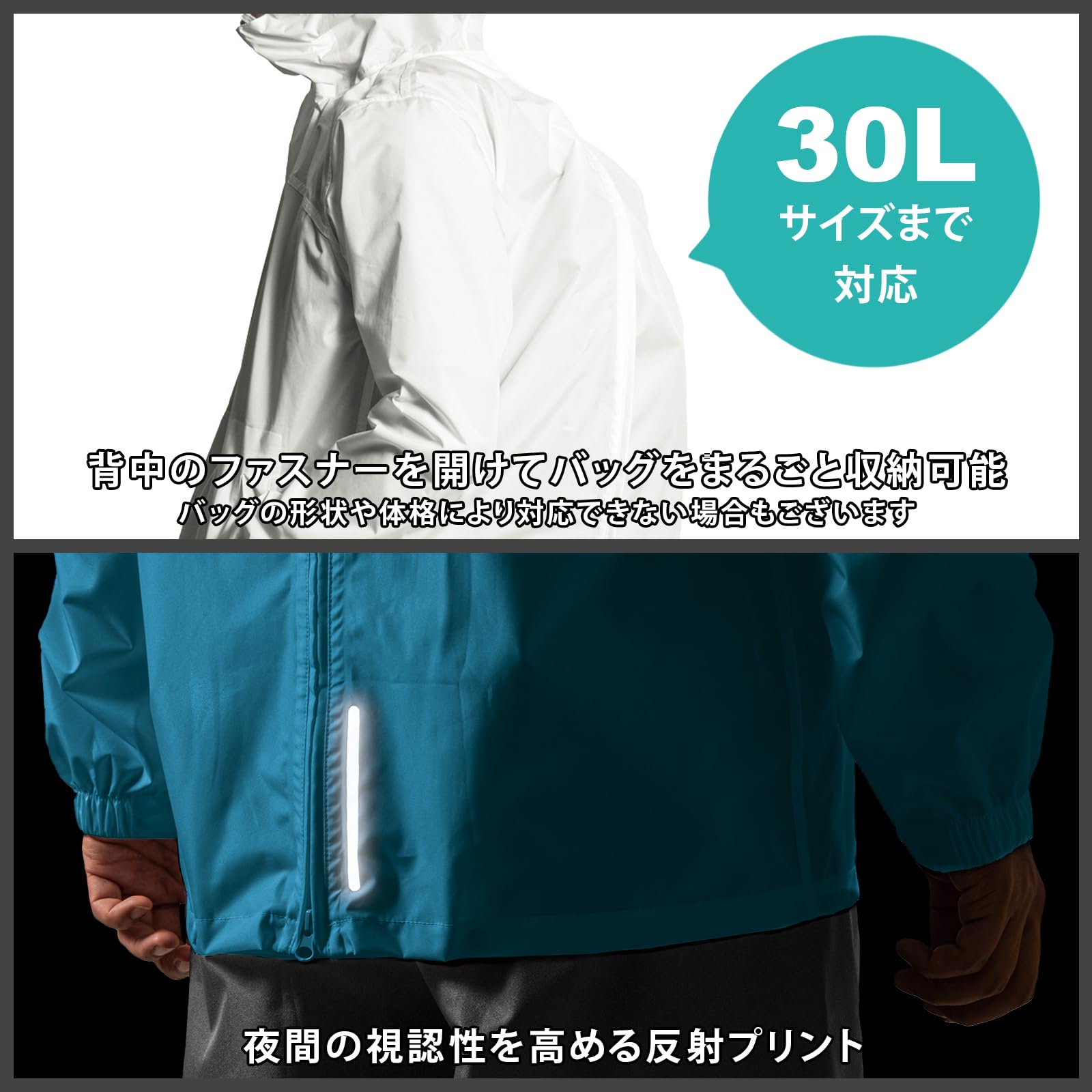 【特徴】背中のファスナーを開けてバッグをまるごと収納可能なレインスーツです。30Lサイズのバッグまで対応(※バッグの形状や体格により対応できない場合もございます)。フード・足元の調整が簡単に行えます。フードの調節コードで頭と首元をぴったりフィット、サイズ調整テープで視界すっきり。フードを丸めて専用テープで立ち襟にもできます。さらにファスナーの内側には正面からの雨や水滴の侵入を防ぐシームテープ加工が施されており、スーツ内部への水滴の侵入を大幅にカットできます。夜間の視認性を高める反射プリント、靴の隙間から水滴の侵入を防ぐ裾アーチカバーを採用。また、表生地は環境に配慮した撥水材を使用しています(非フッ素撥水)。通勤・通学・アウトドアなど様々な場面でマルチにお使いいただけます。