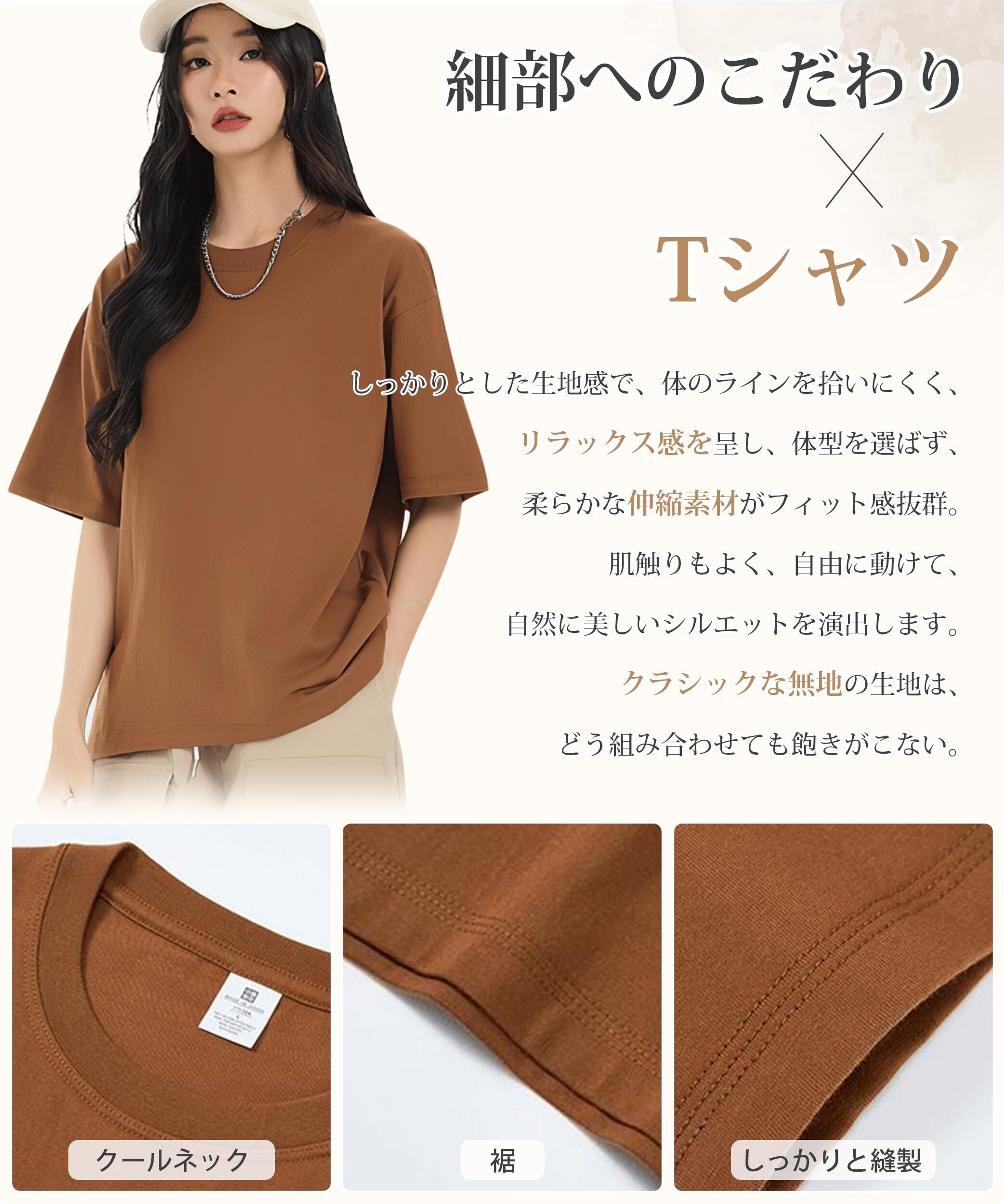 【定番こなれ綿100半袖Tシャツ】春夏シーズンにぴったり、肌なじみの良さと通気性を両立した半袖Tシャツが登場!肌触りが良く、通気性が抜群な綿100%素材を使用し、汗をかいても爽やかな着心地。丸みを帯びたクルーネックが首元にぴったりフィット、すっきりとしたラインが顔周りを自然に引き立て、さりげなく小顔効果を叶え、日常の中で少しの華やかさをプラス半袖Tシャツ。程よく肌見せ感があり、ちょうどよい露出度が、カジュアルな中にも女性らしい柔らかさを引き出します。春夏の定番半袖Tシャツとして、どんなスタイルにも合わせやすく、20代の若々しさから40代の落ち着きまで、幅広い世代に大人気な半袖Tシャツです。