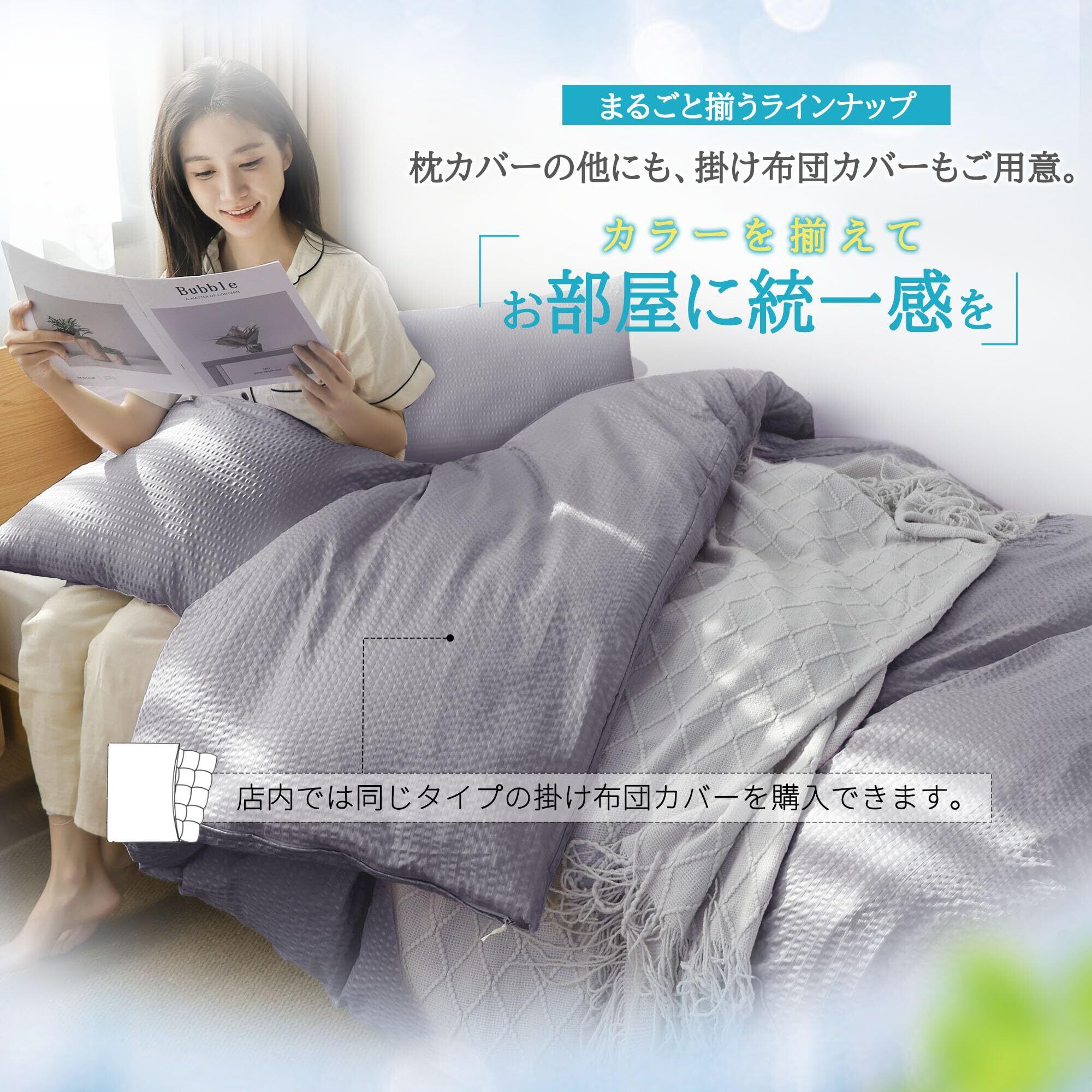 【シアサッカー風生地】枕ガバーはサラッとドライタッチな表面がポコポコとしたシアサッカー風の素材を使用。シアサッカーとはさらりとした感触で肌ざわりもよく、涼しくて快適な夏にオススメの素材です。くしゆくしゅしたシワ感が特徴的な凹凸感のある生地です。四季を通じて利用できます。