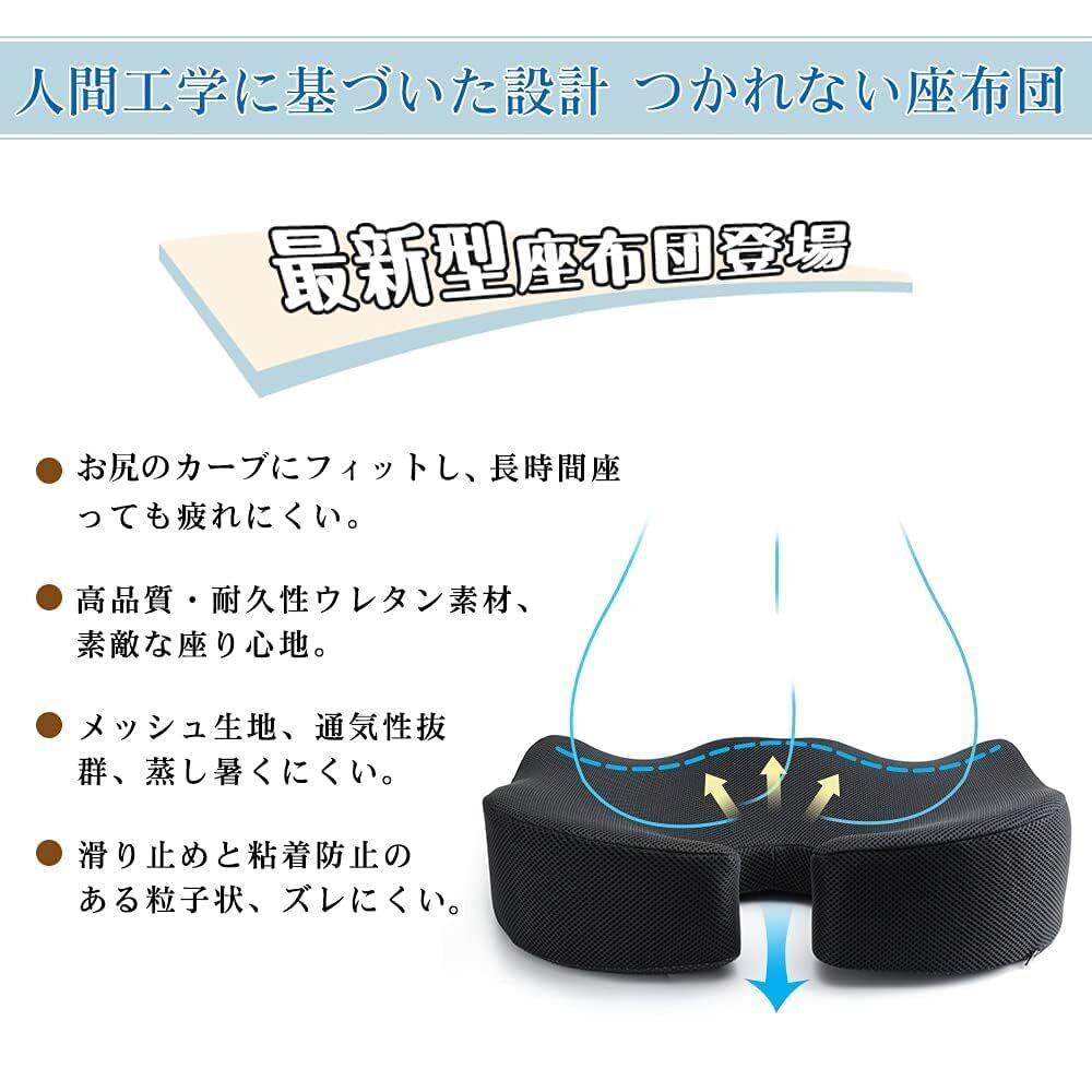 【お尻を包んで支える立体設計】やや凹みで両側は自然にお尻にフィットし、お尻にかかる圧力を分散します。【前端はW字型デザイン】両側はお尻の圧力をよく吸収します。自然にお尻を合わせて優しく包み込んで、フィット感抜群。【後端はU字型デザイン】 ユニークなU型構造で尾てい骨など弱い部位を避け、従来のクッションよりもたらす尾椎のあっぱく感という欠点を改良した。座った姿勢から尾骨にかかる圧力を軽減し、 尾てい骨を優しくケアし、座り心地良いです。また、この独自の設計により、クッションの通気性が良くなり、長時間座っていても蒸れにくくなります。