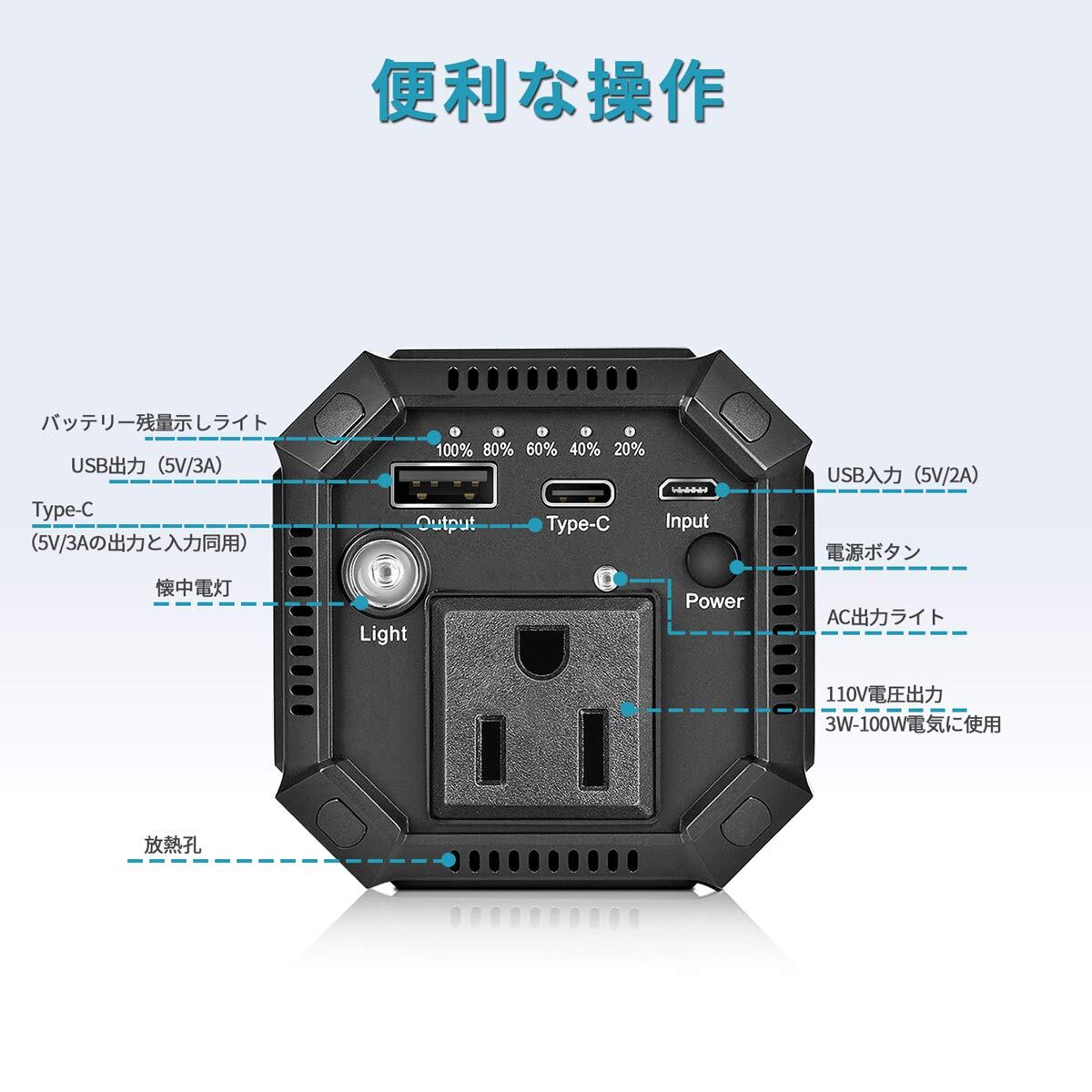 【多様な出力モード】ACコンセント(110V)+USBポート(5V/2A)+Type-Cポート(5V/3A)、幅広い電気機器(3w-100w)へ給電できます。
