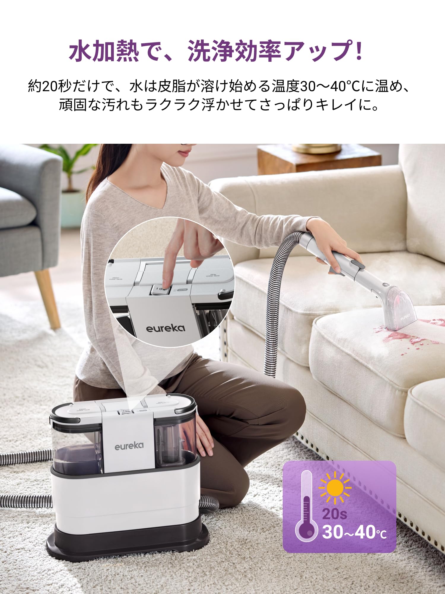 ❶【布製品は熱湯で深く洗浄する】 約20秒だけで、水は皮脂が溶け始める温度30~40℃に温め、頑固な汚れもラクラク浮かせてさっぱりキレイに。カーテンや大きなぬいぐるみ、車のシートなどにも使え、車シートクリーナー、ソファクリーナー、カーペットクリーナーの機能を備えたリンサークリーナーです。