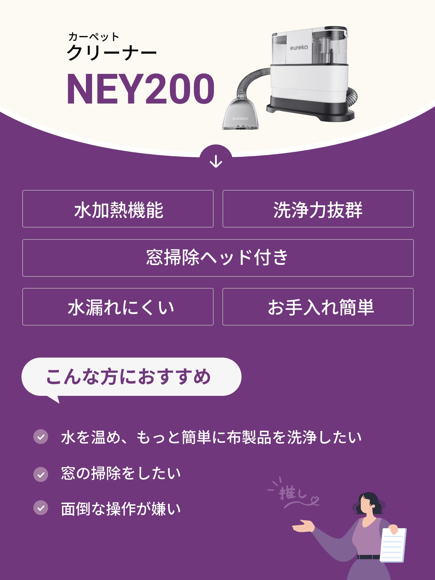 EUREKA(ユーリカ) NEY200 カーペットクリーナー 加熱式 布洗浄機 リンサー洗浄機 窓掃除 ガラスクリーナー ソファ 水洗い 絨毯クリーナー 車用掃除機 乾湿両用掃除機 カーペット 布製品 マットレス ペットベッド 車内 ラグ ぬいぐるみ