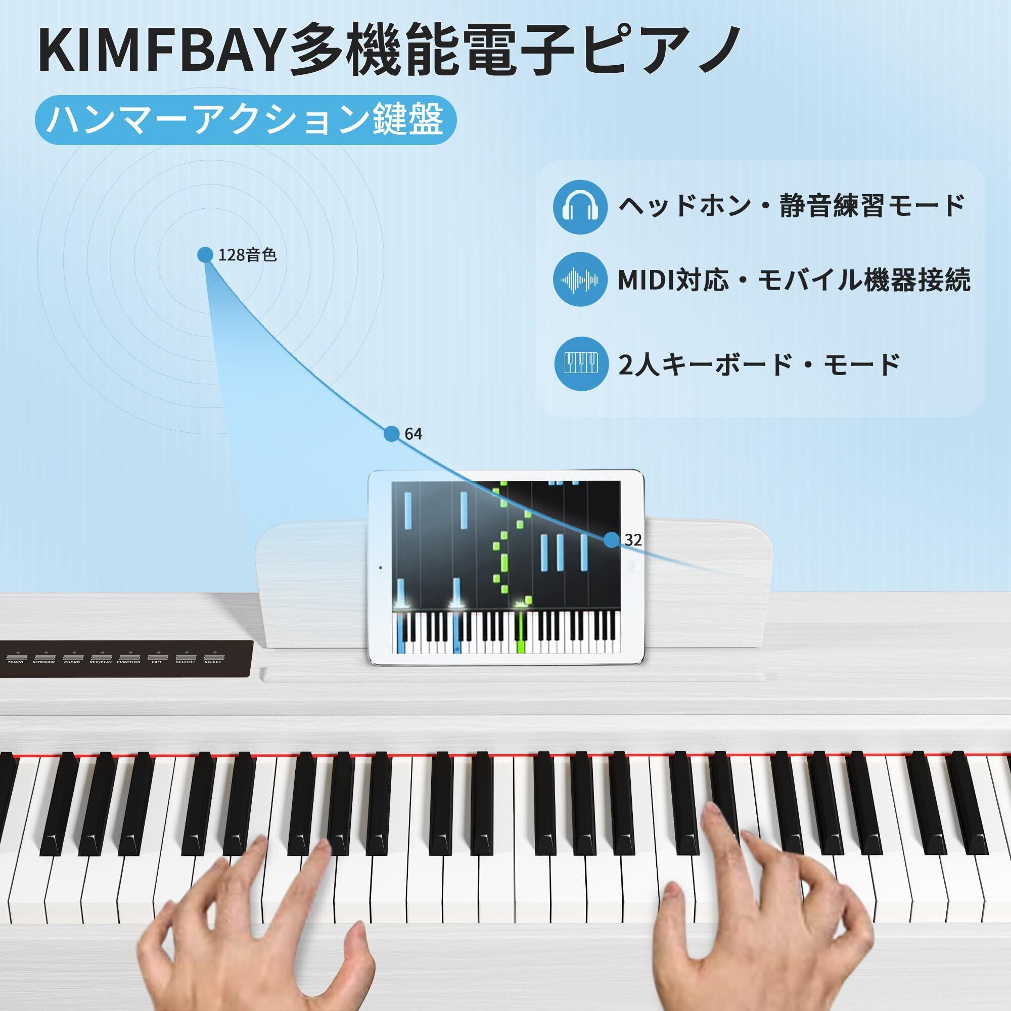 【ハンマーアクッション鍵盤 電子ピアノ】KIMFBAYの電子ピアノは、本物のピアノに非常に似たハンマーアクション鍵盤を備えており、伝統的なピアノと同様の感触と抵抗のフィードバックを提供し、初心者が徐々にスキルと感触を向上させるのに役立ちます。