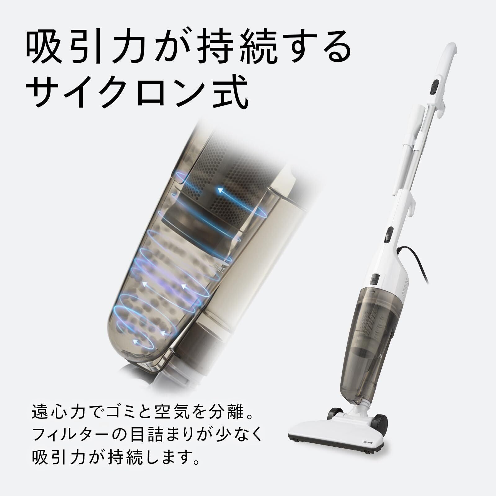 【サイクロン式だから吸引力が持続】遠心力でゴミと空気を分離。フィルターの目詰まりが少なく吸引力が持続します。アウターフィルターと布フィルターの2層構造で微細なゴミやほこりをしっかり取り除きます。