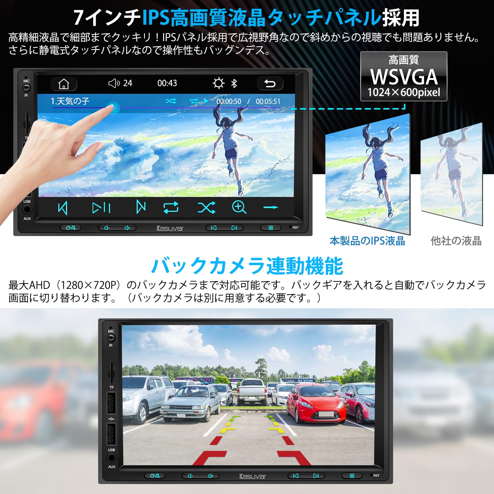 KASUVAR 2DIN 7インチ ディスプレイ オーディオ 30バンドEQ 1024×600P IPSタッチパネル FM/AMラジオ スマホ連携で無線CarPlay/AndroidAuto、Youtubeをミラーリングする バックカメラ連動、ステアリング制御、アンプ内蔵、映像出入力、USB/SD動画音楽再生可能な多機能カーオーディオ一体型車載ナビ Bluetooth5.0 技適取得【KAR7】