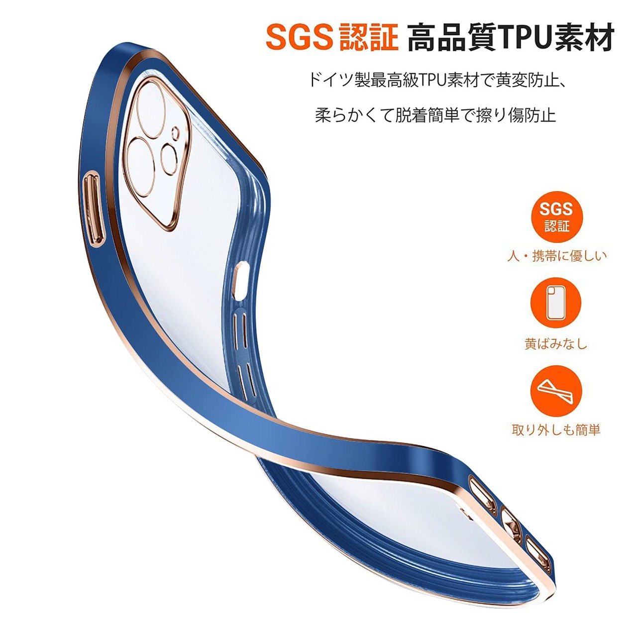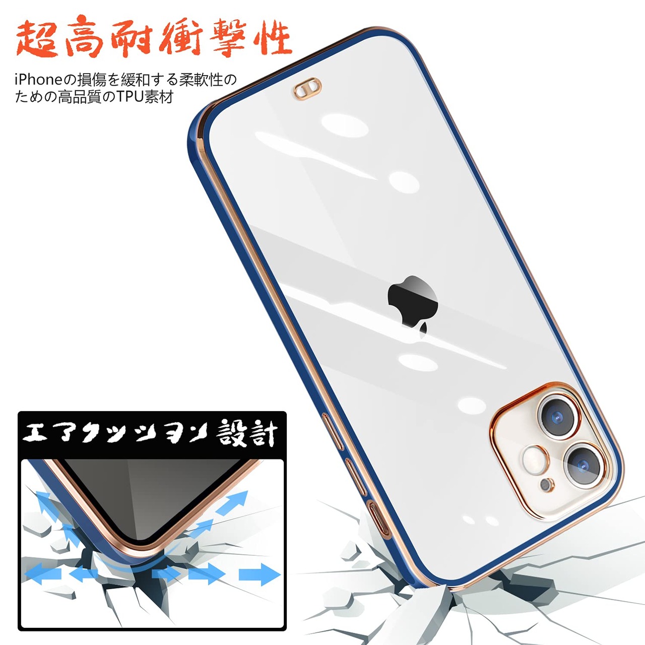 iPhone12 ケース クリア メッキ加工 耐衝撃 透明 TPU 落下防止 防塵 薄型 軽量 アイフォン12 カバー 変形防止 人気 おしゃれ (ネイビー・ブルー)