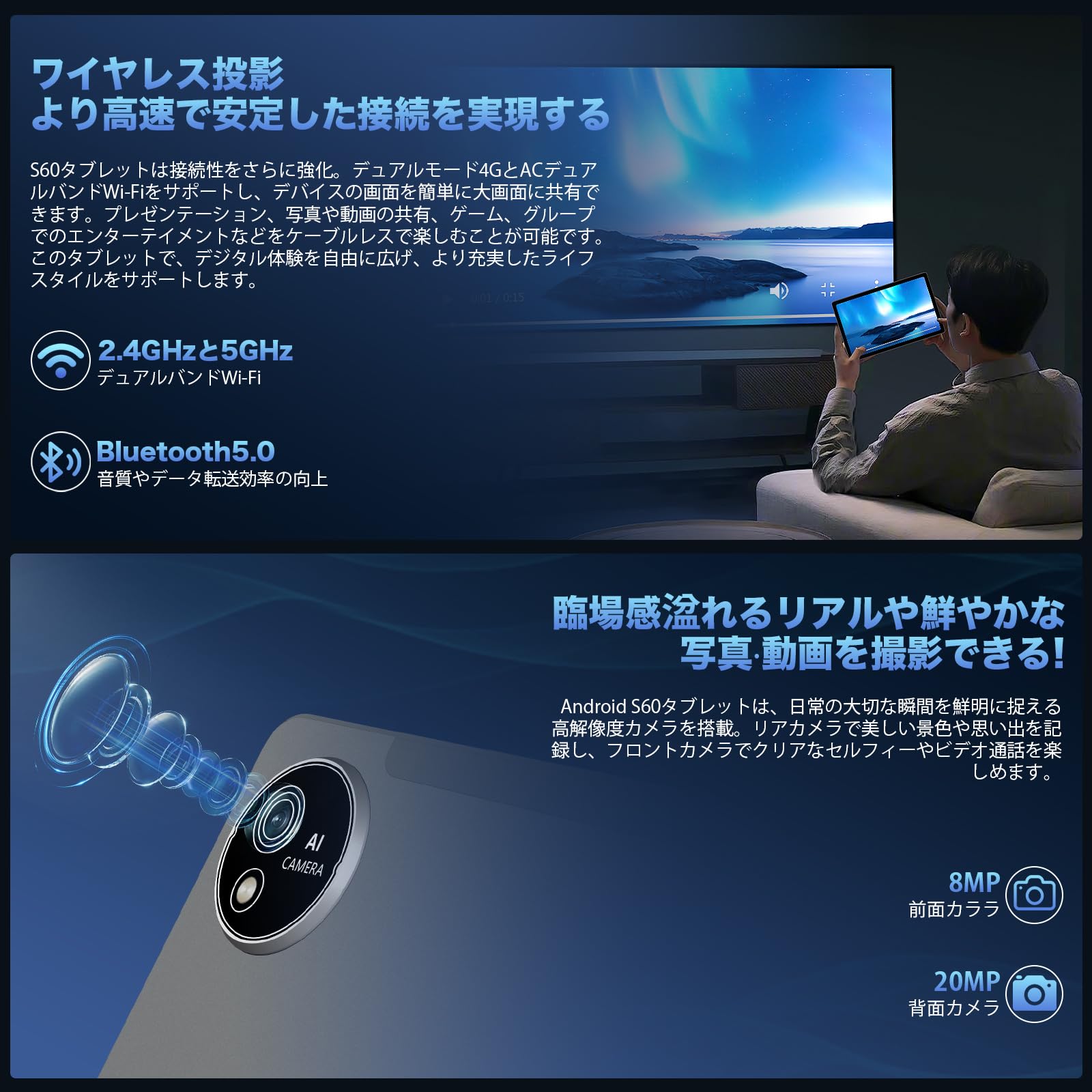 ️「10.4インチ・2K IPSディスプレイ・Android 15・Widevine L1タブレット」Android 15搭載のタブレットS60は、2K IPSディスプレイを採用しており、最大解像度は2000*1200に対応しています。HDディスプレイ搭載タブレットに比べ、より鮮明な画質、鮮やかな色彩、広い視野角を持ち、優れた視聴体験を提供します。さらに、Incellスクリーンフィッティング技術により、液晶層とタッチ層の間にある空気層を排除し、タッチ感度を向上させると同時に、端末の厚さと重量を軽減しています。AndroidタブレットS60は、Widevine L1 DRM保護に対応しており、Netflix、Amazon Prime Video、Disney+、Huluなどのサービスで高画質コンテンツを楽しむことが可能です。高精細な映画視聴、ゲームプレイ、写真や動画の閲覧、さらには日常の作業にも最適です。視野角は180度で、アスペクト比は16:10。カラーは鮮明で、細部までシャープに表現されます、無線投影にも対応しており、簡単に大画面テレビに接続して楽しむことができます。