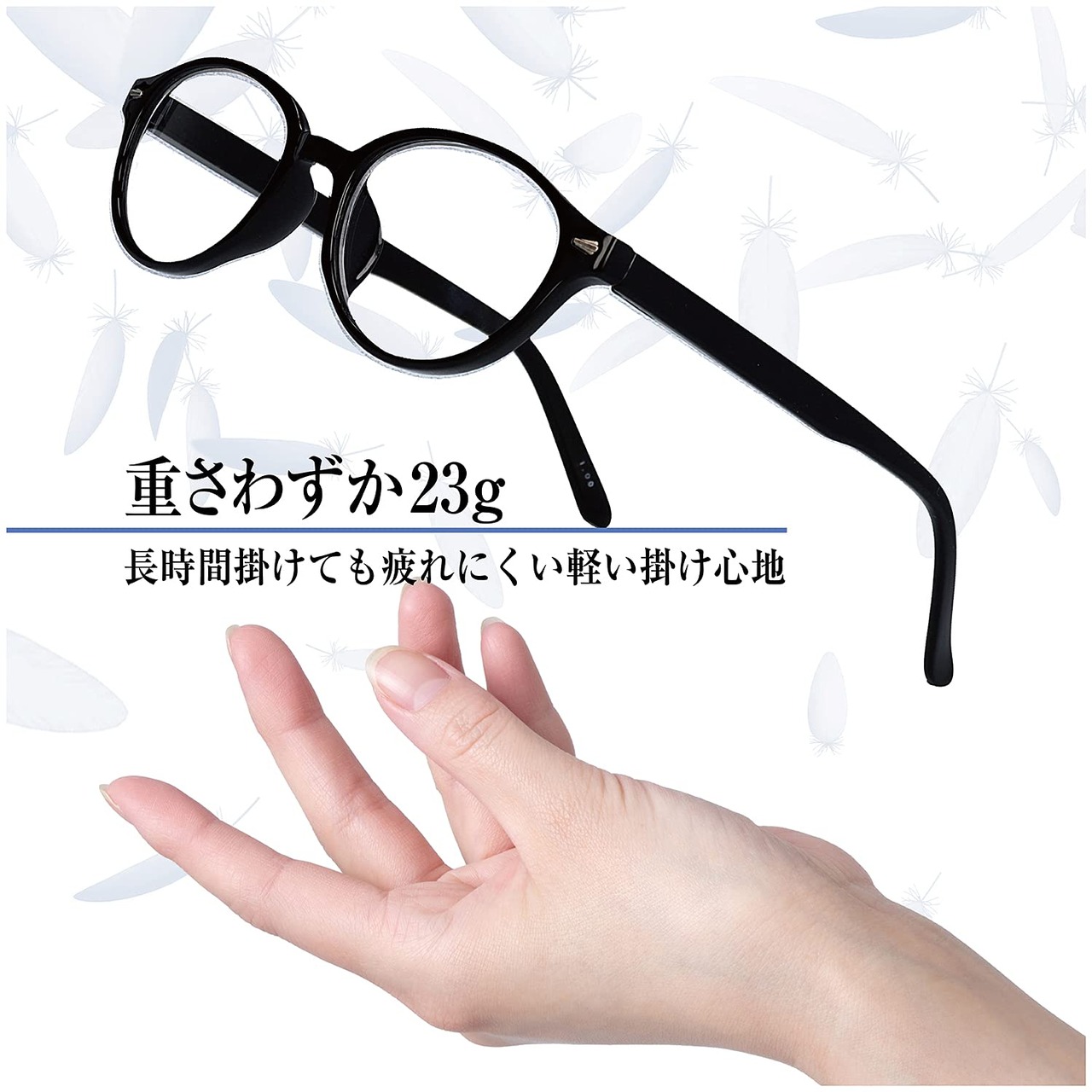 【ソフトな掛け心地】軽量樹脂を採用しており、重さわずか23グラム。(+1.50で計測)普段メガネを掛けない方でも、鼻や耳が痛くなりにくく、違和感なく掛けていただけます。バネ丁番なので、つるがこめかみを圧迫することなく、柔らかい掛け心地であると同時に、程よいホールド感でお顔を包み込みます。下を向いてスマホやタブレットを使う時や新聞や本を読む時も、ズレ落ちにくく、快適にご使用いただけます。