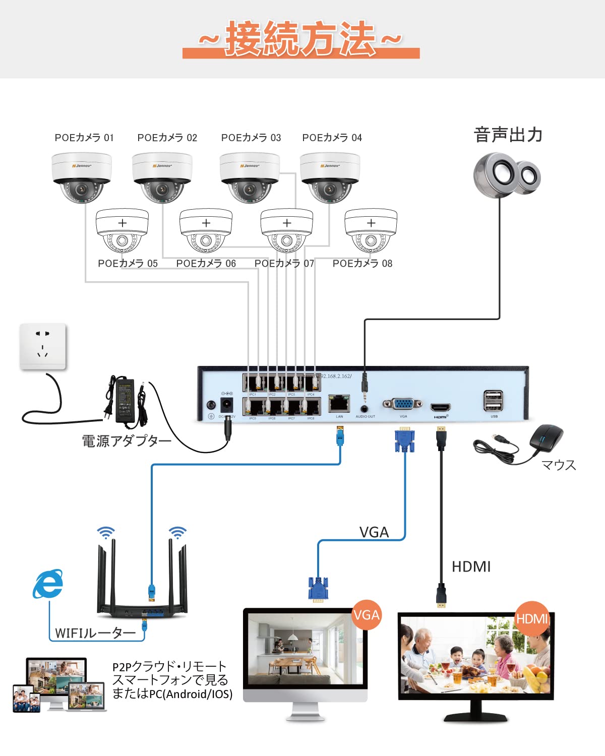 【最新4K超高画素の親機ドーム型防犯カメラ】JENNOV録画機は800万超高画素に対応する為、800万/500/300/200万画素POEカメラと互換性があり、カメラの性能をフルに発揮します。また、POE防犯カメラは500万画素のチープを採用しており、2560X 1920の高い解像度で撮影、鮮明かつきれい、高精細度な映像が映ります。さらに、ドーム型のミニーカメラ(角度の自動回転不可)と組み合わせ、空間が取らず、見た目アップの監視カメラが登場!天井に取り付けられ、屋外も対応可能。お家のデザインに合わせる可愛い型の防犯カメラです。