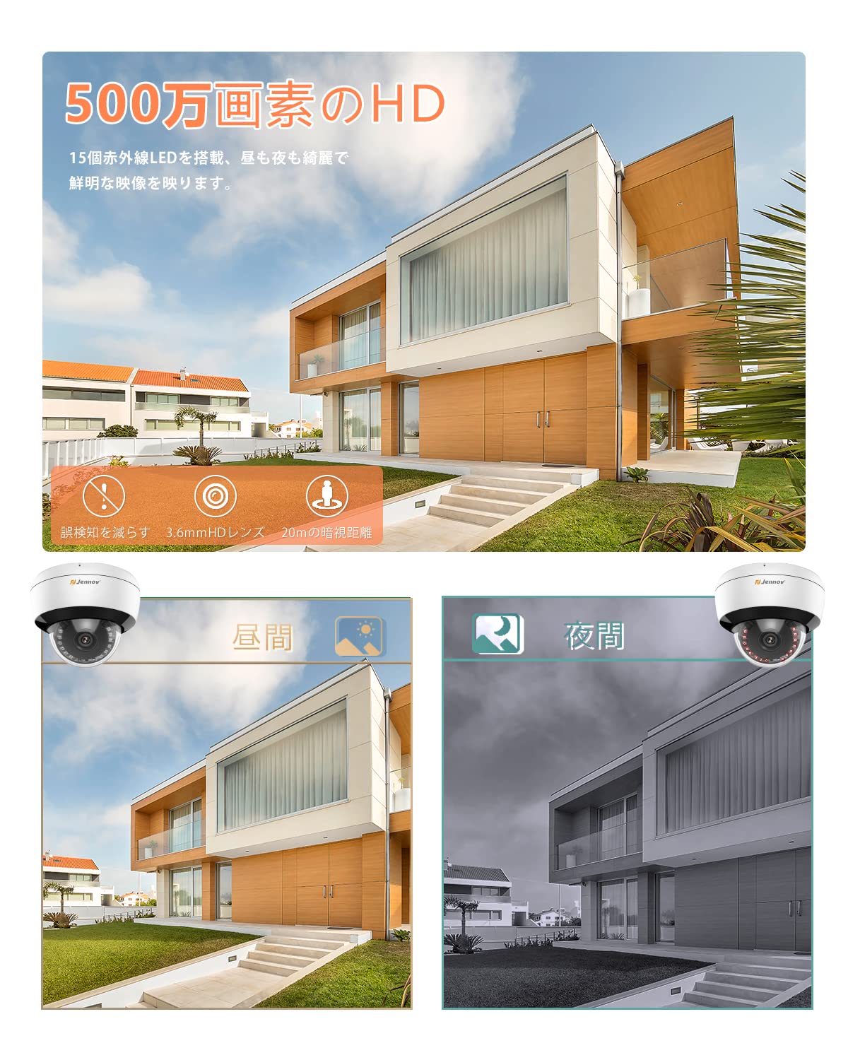 【800万画素対応】JENNOV 防犯カメラ 屋外 poeドーム型防犯カメラ 500万画素 AI人体検知機能 3TBHDD内蔵 24時間録画機能付き 室内 有線監視カメラ 4台セット 音声記録 4K録画機NVR 室内カメラ 暗視撮影 スマホ連動 PTなし 自動回転不可 IP66防水防塵 スマホ/パソコン/Ipad対応 TSEyeアプリ対応 電源不要