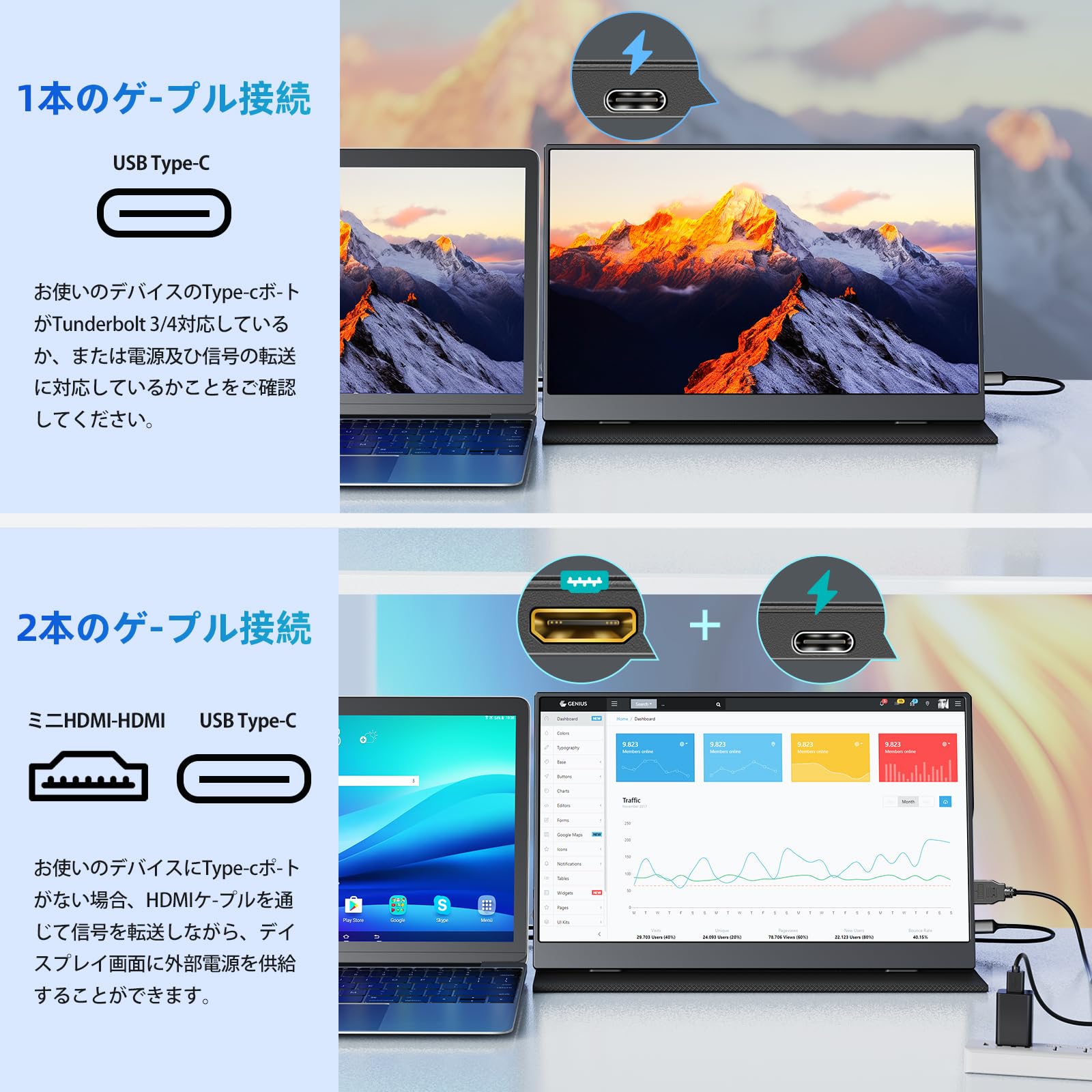 【ケーブル1本映像出力と電源供給・幅広く機種に対応】Type-Cケーブルを経由で接続対応のPCやスマホなど、映像出力と電源供給を1本のケーブルで行うことができます。(※給電が足りない場合は付属のACアダプターをご使用ください。接続がすごく簡単なので、いつでもどこでもYouTubeやゲーム・映像を楽しめて、ビジネスではweb会議やプレゼンテーションにも使えます。ノードPC、デスクトップ、スマートフォン、PS4/PS5、XBOXやSwitch、Macbook、MacMini、Ipad(Type-Cポートモード搭載)など、幅広いデバイスに対応しています。パネル拡張モードやコピーモードに対応し、横型ディスプレイを簡単に設置することができ、仕事の相談やプレゼン、ゲームや映画を楽しむなど、いつでも気軽に利用することができます。