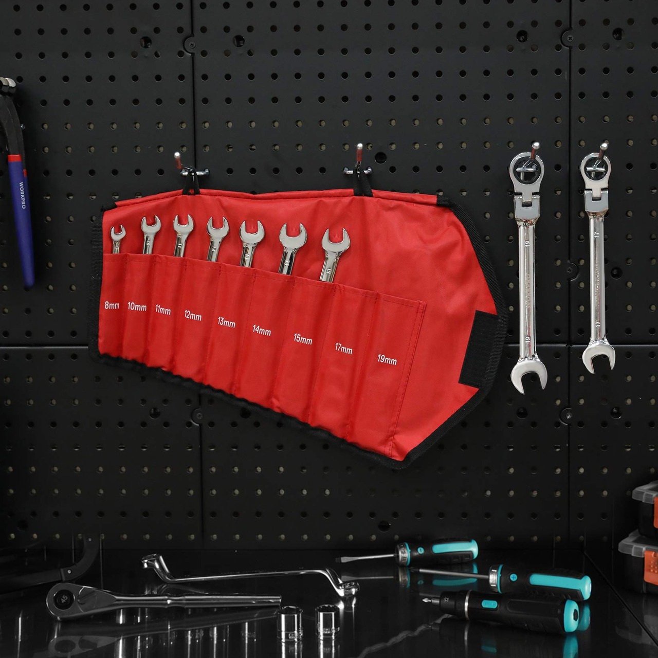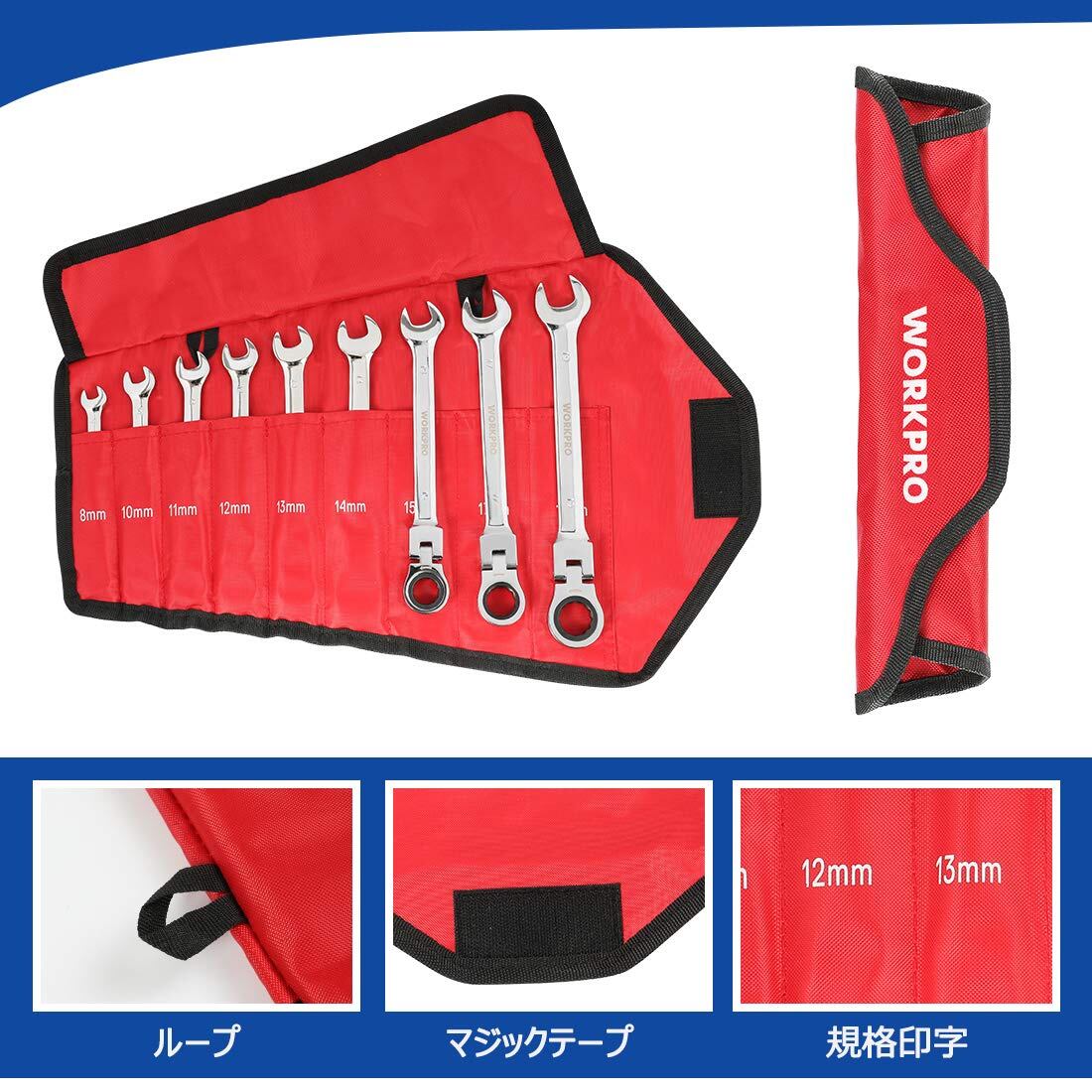 【特価商品】WORKPRO フレックスラチェットレンチ コンビネーションレンチ 首振り 8~19mm 72ギア 9本組 スパナ 組み立て 自動車修理 メンテナンス いじり DIY用 収納バッグ付 | asaRulu0511