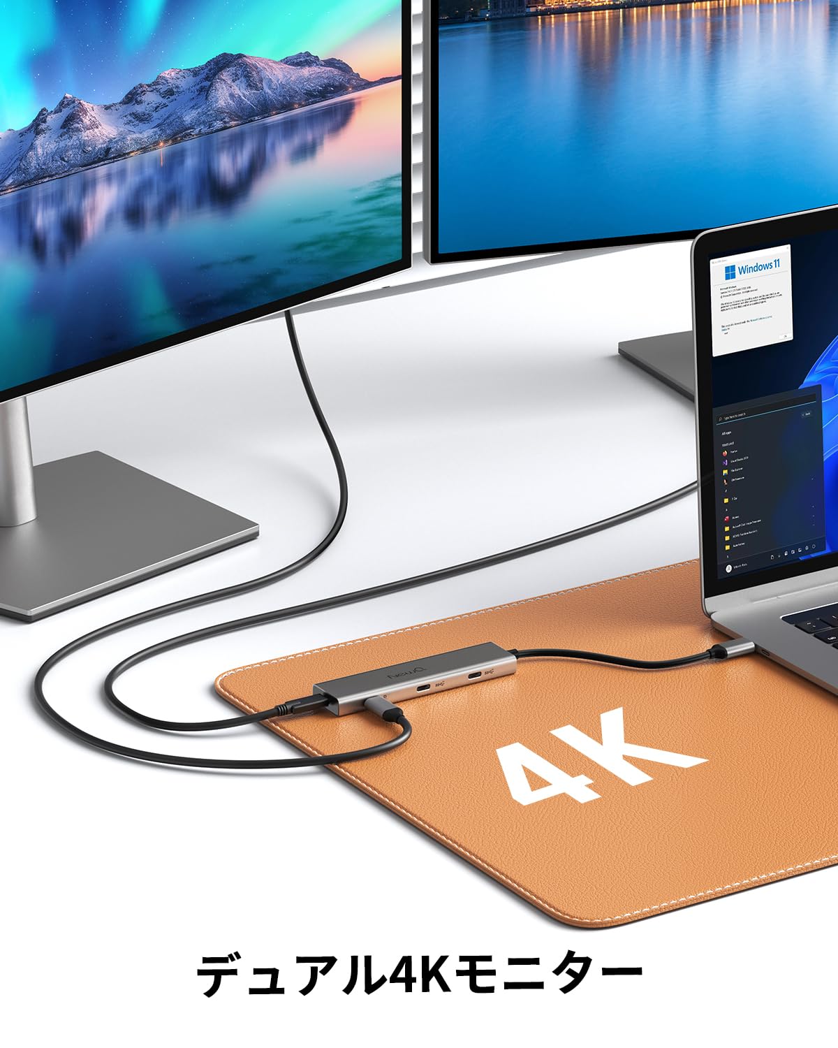 【デュアル4Kモニター対応|拡張性に優れた設計】usb c hub 4k 60hzは、DP1.4対応のノートパソコンにて4K@60Hzデュアルディスプレイ出力をサポート。2台の4k usb c monitorによる拡張表示で、生産性を大幅に向上させます。(※MacBookは拡張表示で1台のみ対応)