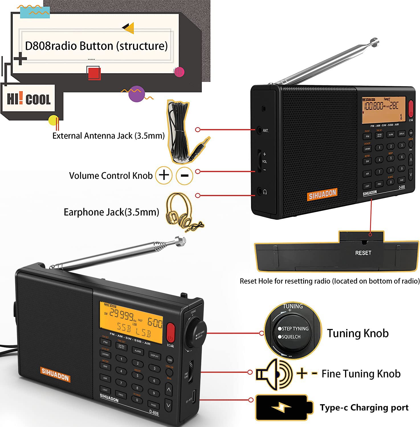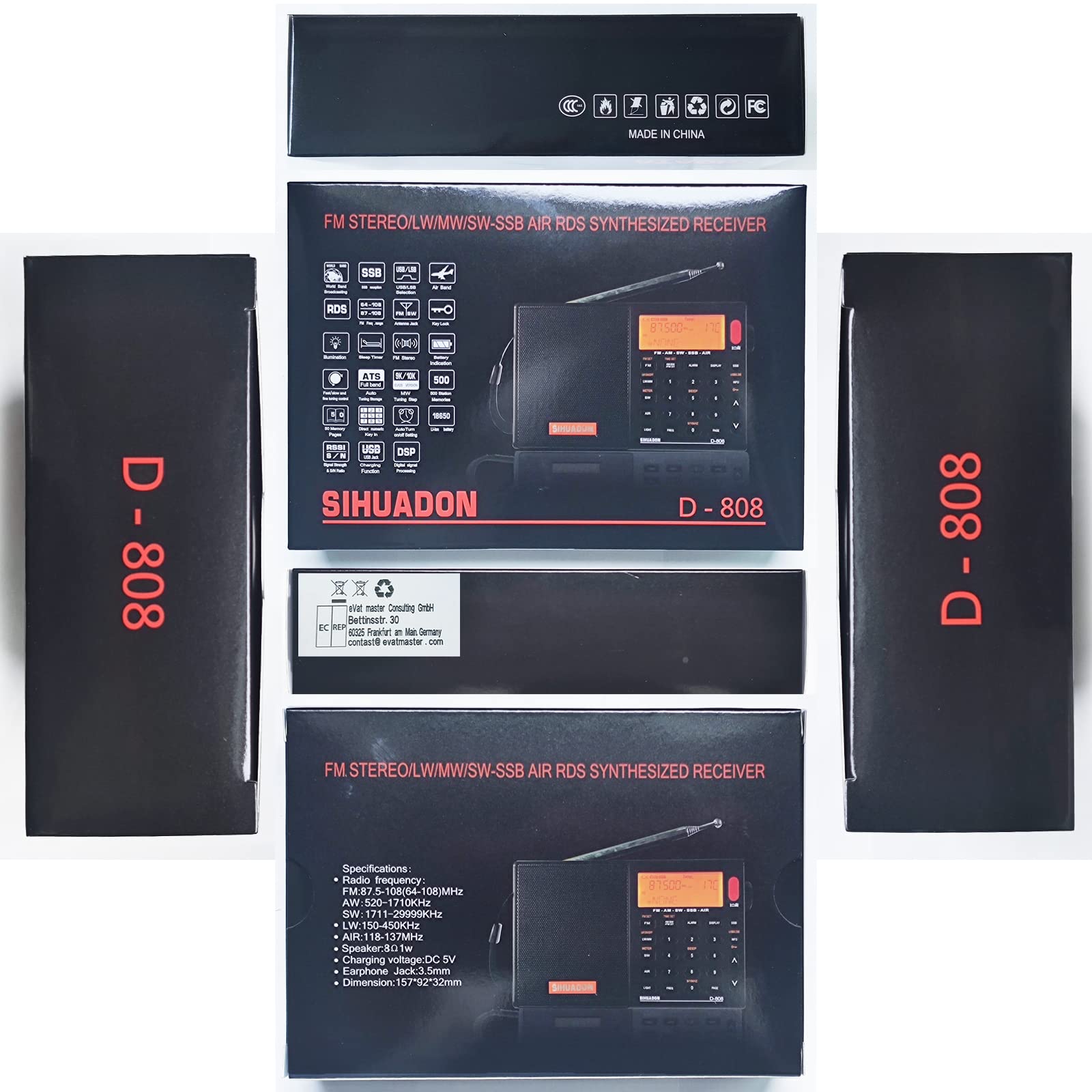 SIHUADON D-808 ポータブルラジオ FM/AM/SW/LW/エアバンド ポケットラジオ SSB/BCL/DSP/RDS 高感度 小型 超軽量 電池式 充電式 オートオフ機能付き 操作簡単 日本語説明書付き