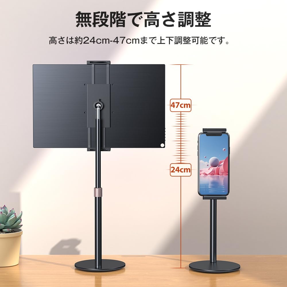 【高さ調節可能・耐荷重5KG】 EVICIV進化版のタブレットスタンドは24cmから47cmまで高さ調節可能です。あらゆる身長の人にフィットし、人間工学に基づいた角度と高さを最も快適に見ることができます。今までのお客様のご意見を元に『揺れやすい、不安定、倒れやすい、操作が不便』などと言う欠点を完璧に解消しました!タブレットホルダーは最新の台座を採用し、他社製品の20倍以上の安定性があり、耐荷重は5kgと使いやすいです。