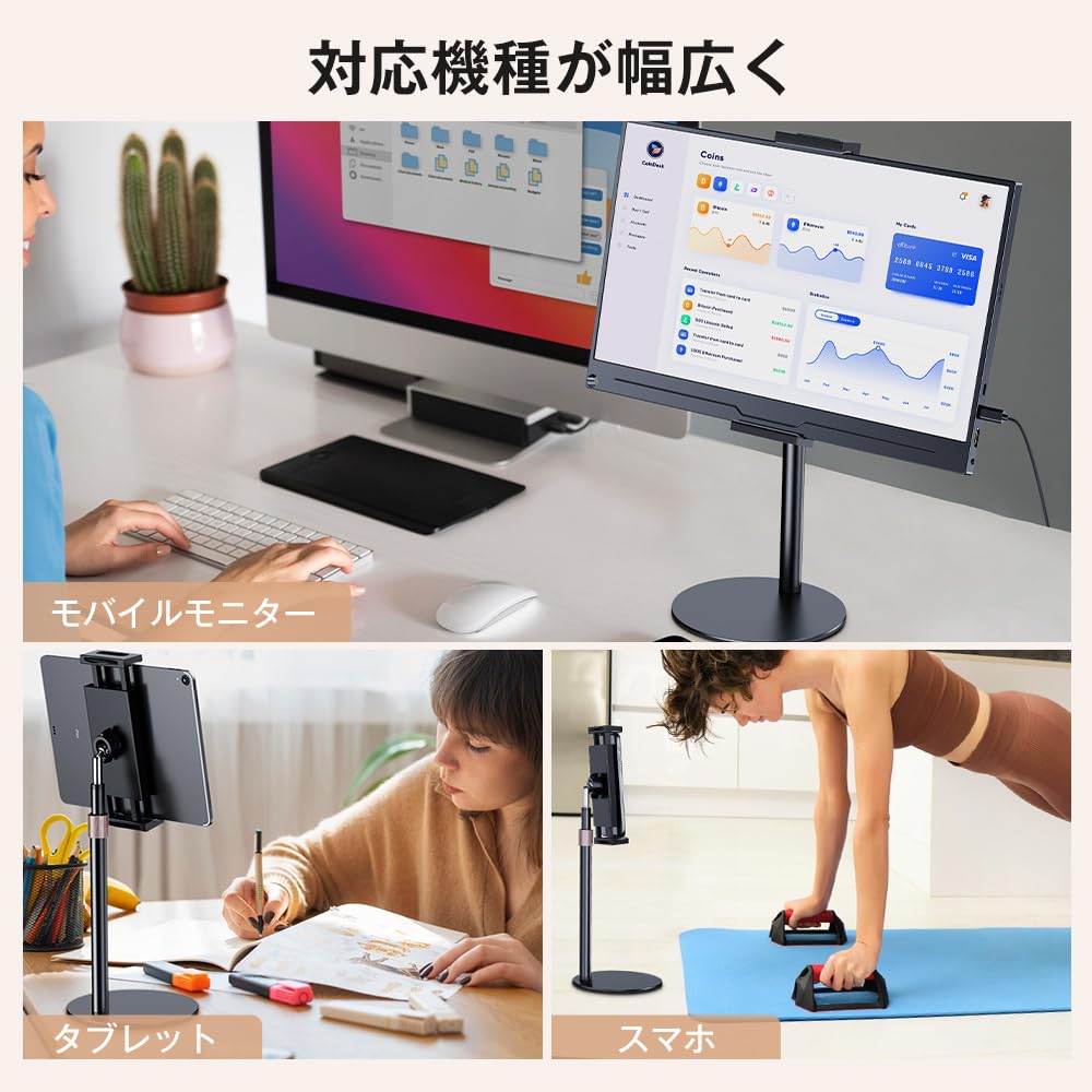 【4.7~15.6インチ対応】ホルダー部の長さは14~25㎝まで伸縮、ほとんどの4.7~15.6インチのスマホ、タブレット、モバイルモニター( iPad Pro 7.9 / 9.7 / 10.5, iPad air 2 3 4, iPad mini2 3 4, Samsung Tab Galaxy S8 S7 S6, Note 6 5, LG, Sony, Android Nexus 7, Kindle, Nintendo Switch, fire hd 8, Huawei MediaPad, iPhone XS/XS Max/XR/X 8 7 6 6s Plusなど)に対応できます。また、寝室での動画鑑賞、YouTubeを見る、在宅勤務、オンライン授業など、どんな場所でもご好みのように使用可能です。