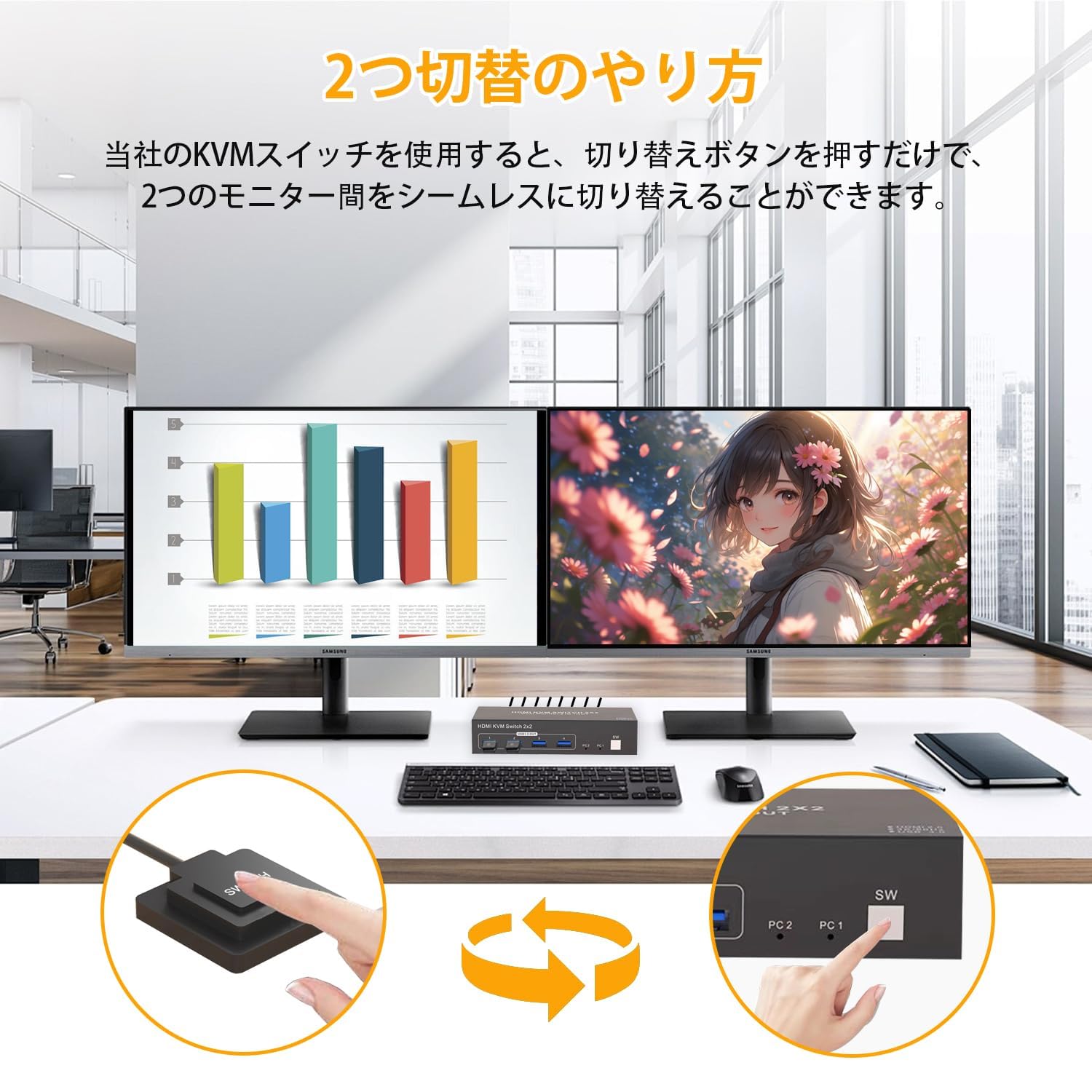 【HDMI 2入力2出力】HDMI KVM 切替器 2PC 共有 デュアル ディスプレイ 同時出力 USB3.0 KVM スイッチャー 4K 60Hz デュアル モニター USB3.0 ハブ スイッチ セレクター 2PC 共有 4USB ポート キーボード マウス 手動 引き出しコントローラー付き