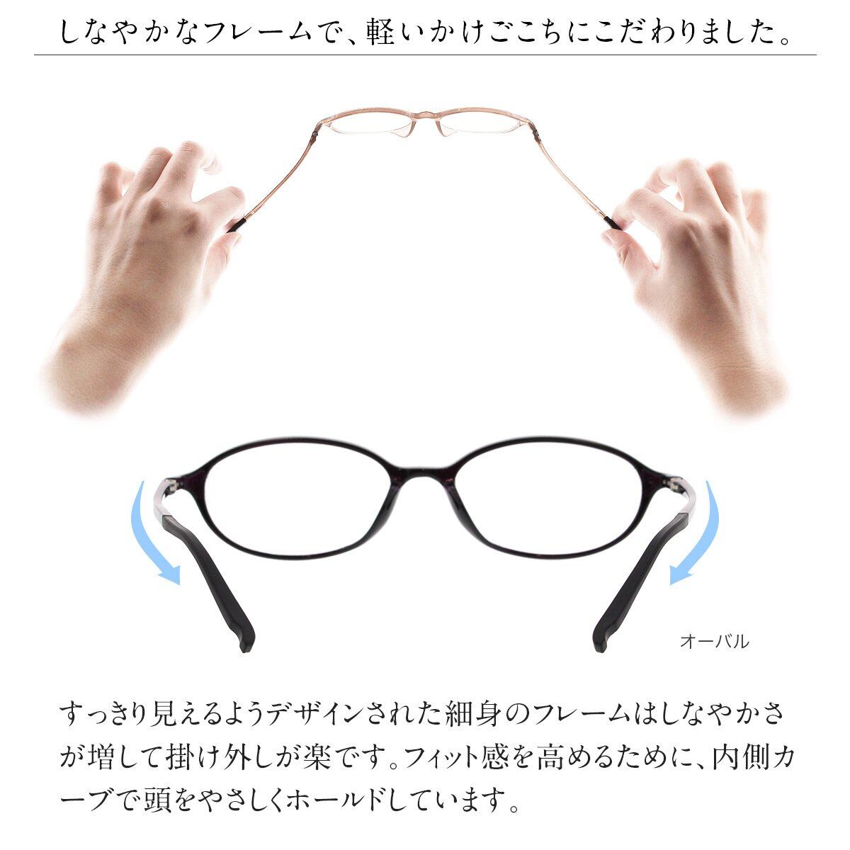 おしゃれな老眼鏡の選び方で迷ったときは重量やフレーム構造、素材、デザイン(色や形状)を気にかけるようにしましょう。このメガネなら、わずか13g、柔らかいフレームでかけ心地も軽く、やさしく設計したオンオフ問わず気軽に使えるデザインとカラーです。(ブルーベリー、ショコラブラウン、アッシュブラウン、クランベリー、ピアノブラックの5色)