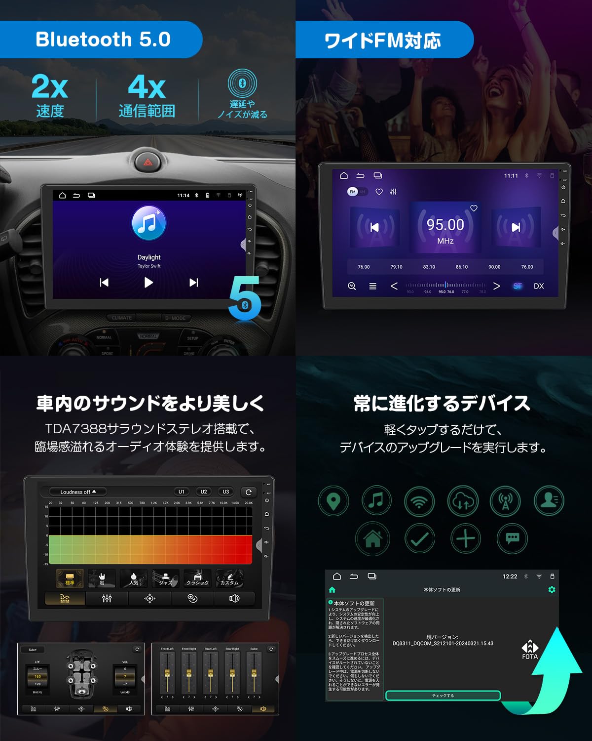 【業界最新Android13】カーナビ製品において最先端のAndroid13システムを搭載、性能の向上に加えて、さらに幅広いのアプリに対応可能に。よりスマートでスムーズな運転体験を提供します。【エネルギー効率の高いプロセッサー】コスパ最高なチップを採用し高性能、低電力を実現。多くのアプリがスムーズに作動し、日常的な処理はもちろん、データの転送もサクサク高速。【日本向け右ハンドル仕様】日本専用で特別に設計されたタッチスクリーンは、右ハンドル仕様 でお客様のニーズに最適なデザインとなっています。【10.1インチIPS大画面】1280×720の超高精細解像度を備え、より精細な画面を映し出すことができます。 新しいドライブ体験を発見し、クリアで詳細なナビゲーション画面を楽しめます。10.1インチIPSタッチスクリーンが、より広い視野を実現、旅をより快適にします!
