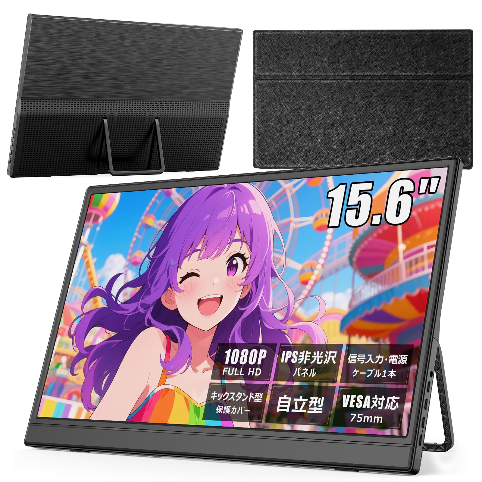 Eleeyak モバイルモニター 【15.6インチ 1920*1080 フルHD】 キックスタンド型&保護カバー 薄型 軽量 モバイルディスプレイ IPS液晶パネル 非光沢 高輝度350nit ブルーカット ポータブルモニター Type-C ミニHDMIポート スピーカー内蔵 VESAマウント スマホ/PS4/XBOX/Switch/PC/Macなど対応