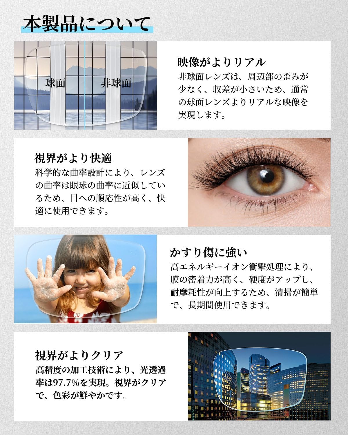 【実用性を追求した機能搭載】 ブルーライトやUVカット機能、紫外線対策で目の疲れを抑えます。最新の非球面レンズを採用することで、メガネの歪みを最小限に抑え、視界をクリアに保ちます。文字や画面がくっきりと見えるので、読書時やデジタル機器操作時の目の疲れが緩和されます。
