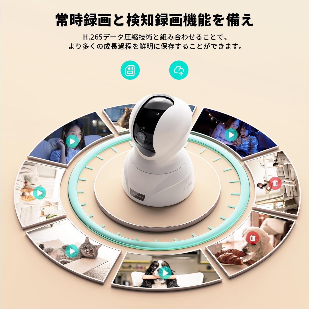 【臨場感溢れる800万画素&PTZ機能&8倍ズーム 】❶1/3"カラーCMOSセンサーと高透過率6層レンズの採用により、業界最高の800万画素を実現しました。鮮明で繊細な映像で、人物やペットの表情がより生き生きとして実景に近く、超高画質の室内カメラで臨場感抜群です。相手の仕草や顔色までくっきりと見えるほど精細な映像を撮ることで、ペットや家族の体調不良に気づき、家族の健康状態にいち早く気を配ることができます。❷操作可能なPTZ機能(垂直115°、水平340°)や8倍デジタルズームもあり、まるで自分の目で見たような自由な視野角が楽しめます。仕事の隙間でも風に吹かれたペットの毛や、子供が寝ている間に呼吸の起伏までくっきりという画面で癒されます。
