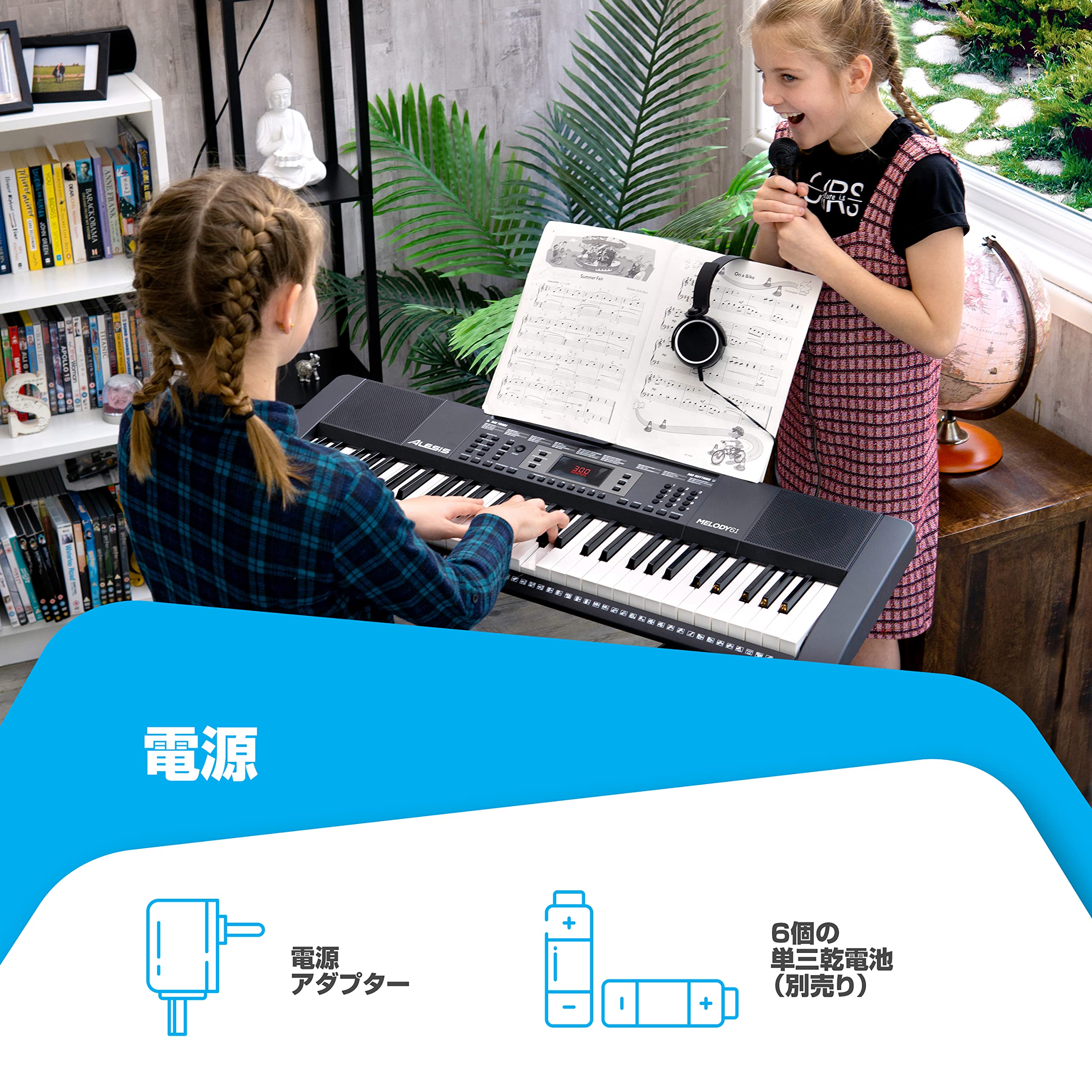 Alesis Melody 61 MKllキーボードは、61鍵のピアノスタイルの鍵盤を搭載し、ピアノ、ストリングス、ブラス、木管楽器、パーカッショ ン、マレット、ギター、シンセサイザー、効果音などあらゆるジャンルの音色を搭載。マイク、ヘッドフォン、楽譜スタンド、キーボードスタンド、椅子、電源など、初めてキーボードをご購入される方に必要な全てをワンパッケージにしました。「デュアル・モード」機能を使えば2 つの音色を同時に演奏したり「スプリット・モード」機能を使えば、鍵盤を2つに分割してそれぞれ異なる音色を割り当てることも可能です。また、40曲のデモ・ソング、300曲もの伴奏を内蔵していますので、様々なジャンルを瞬時に 再生させることができます。更に「レコード・モード」 機能を使えば演奏を録音することもできます。