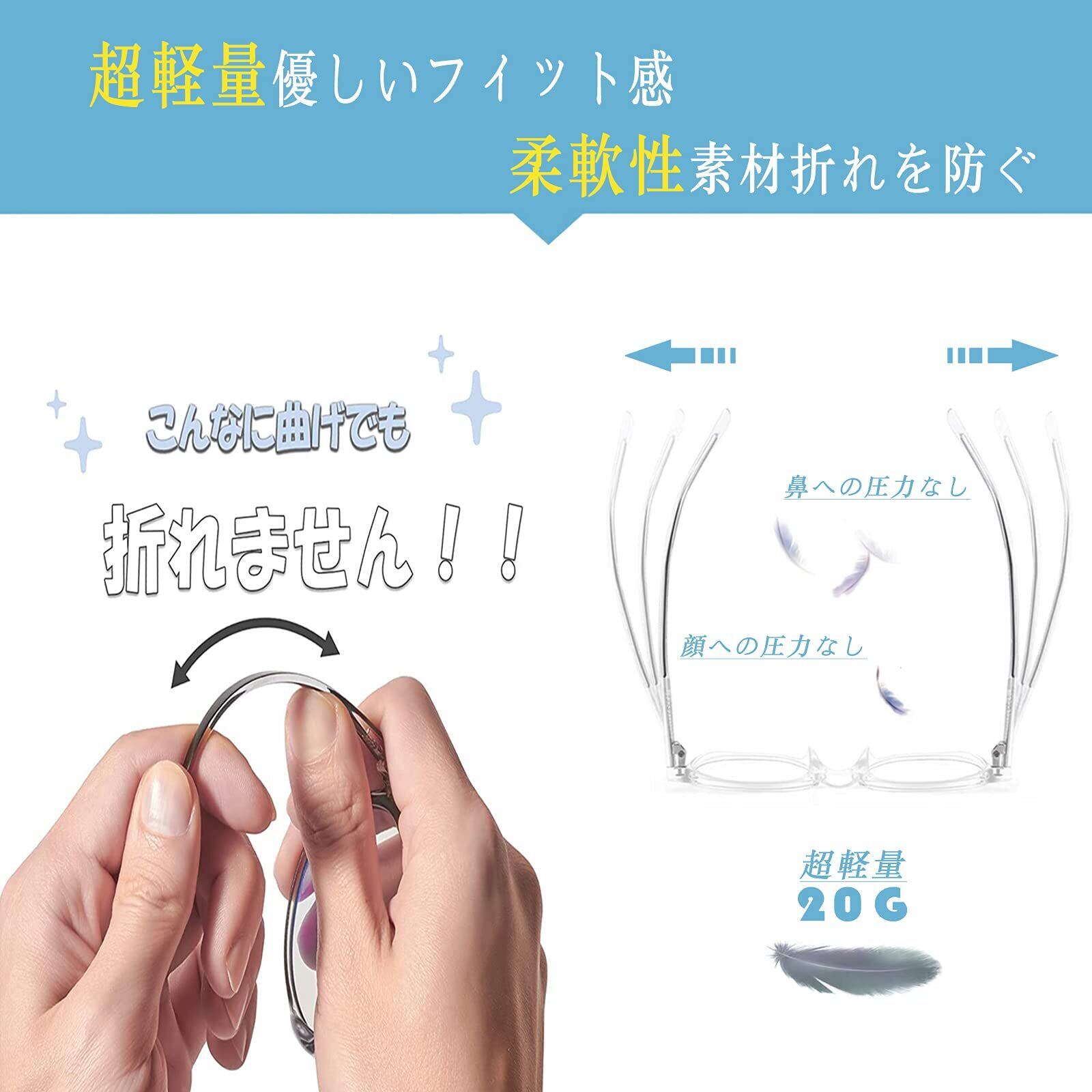 【超軽量・TR90素材による快適なフィット感 】 重さ20gと軽量で、とにかく軽い。軽いだけじゃなく、しなやかで壊れにくい。おしゃれにデザインされているパソコン用メガネです。日本人の顔幅に合わせて設計されており、ぴったりフィットするので快適につけられますよ。フレームが柔軟性に長けているため、顔にやさしくフィットします。レンズにほとんど色がついていないため、色が濁らずクリアな視界を保てるのが魅力。